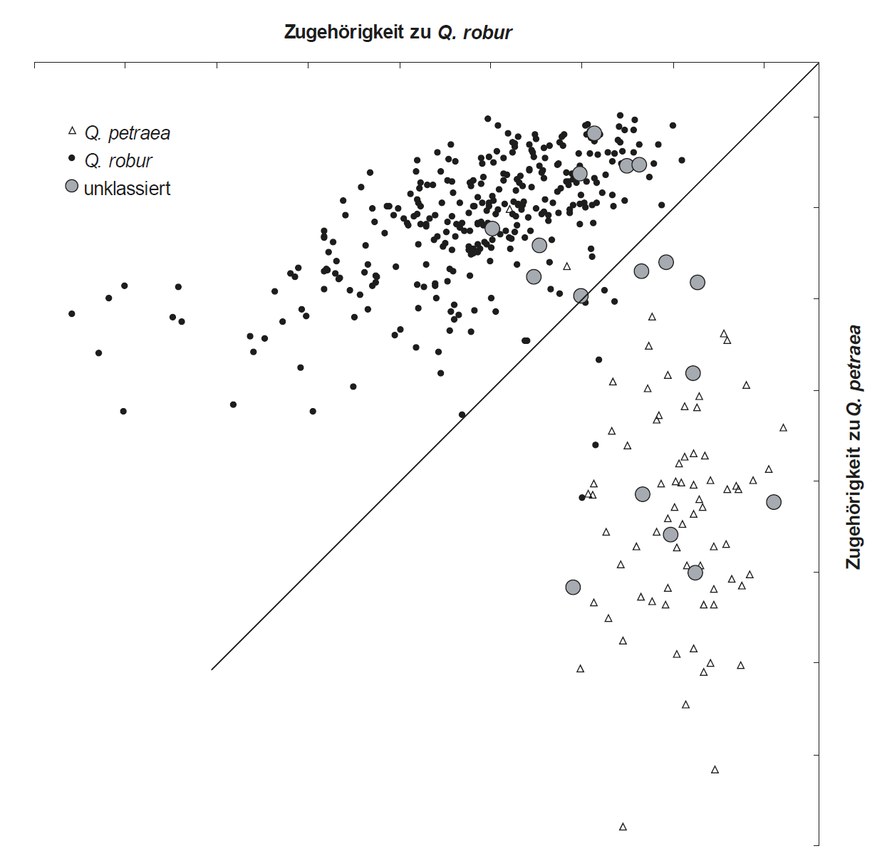 Abb. 4 - Genetische Zuordnung von 414 Bäumen aus einem gemischten Stiel- und Traubeneichen- Bestand in Büren a.A. Die beiden Arten sind je auf einer Seite der Diagonalen angeordnet. Die morphologisch nicht eindeutig bestimmbaren Bäume ("unklassiert") lassen sich aufgrund ihres genetischen Fingerabdrucks in den meisten Fällen gut zuordnen.