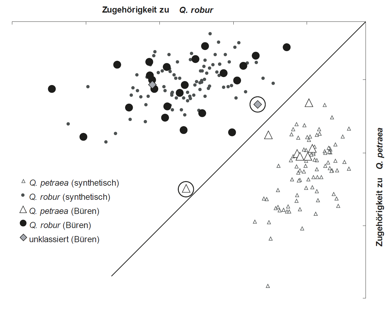 Abb. 6 - Genetisch bestimmte Stiel- und Traubeneichen aus neun Schweizer Beständen wurden zu künstlichen, synthetischen "Genpools" zusammengefasst (kleine Symbole oberhalb bzw. unterhalb der Diagonalen). Die genetische Zuordnung der morphologisch bestimmten Eichen aus Büren (grosse Symbole, vgl. Abb. 4) weicht nur in zwei von 32 Fällen (eingekreiste Symbole) von der ursprünglichen Bestimmung ab.
