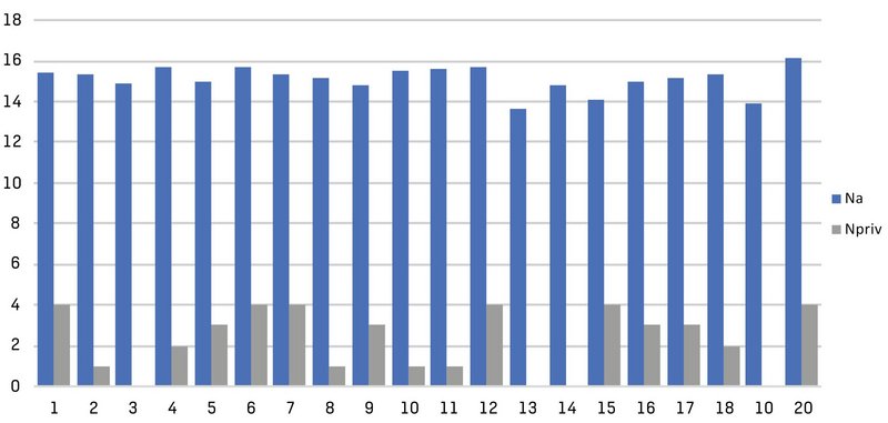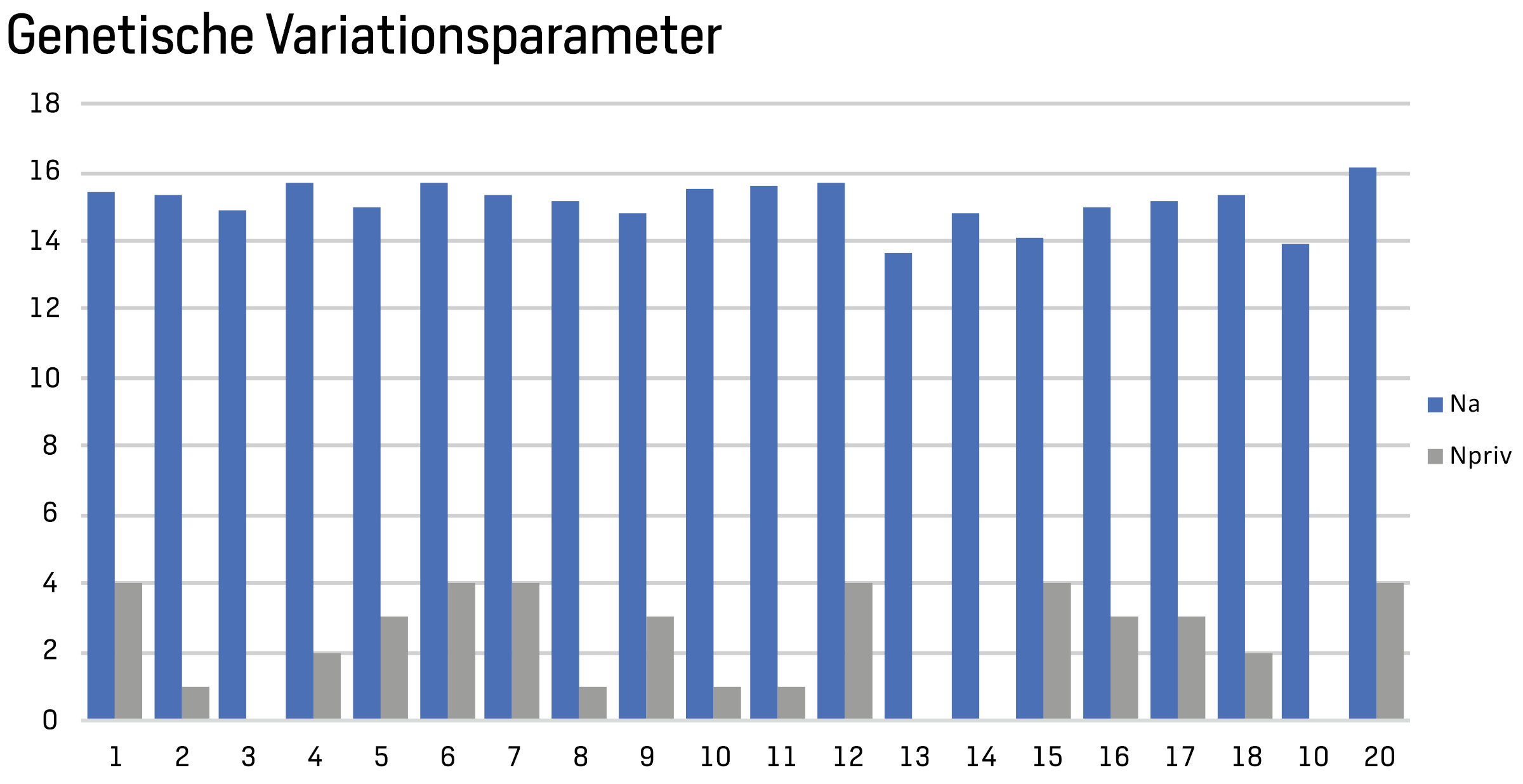 Im Rahmen dieser Arbeit werden die ersten Ergebnisse der genetischen Variationsstudie der Hainbuche in Bayern vorgestellt. Die Anzahl der Allele (Na) schwankte zwischen 13,67 (Population 13-Puschendorf) und 16,13 (Population 20-Freilassing) mit einem Gesamtdurchschnitt von Na = 15,1. Die höchste Anzahl an privaten Allelen wurde in den Populationen 1-Lautertal, 6-Karlstadt, 7-Bamberg, 12-Riedenheim, 15-Kelheim, 20-Freilassing (Npriv = 4) beobachtet (Abb. 2).