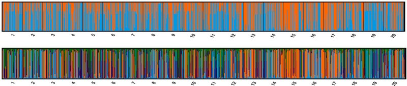 Zur Bestimmung möglicher Cluster bzw. Gruppierungen (K) zwischen den untersuchten Populationen wurden der modellbasierte Cluster-Algorithmus im Programm STRUCTURE und die empirische Statistik deltaK genutzt (implementiert im Programm CLUMPAK).