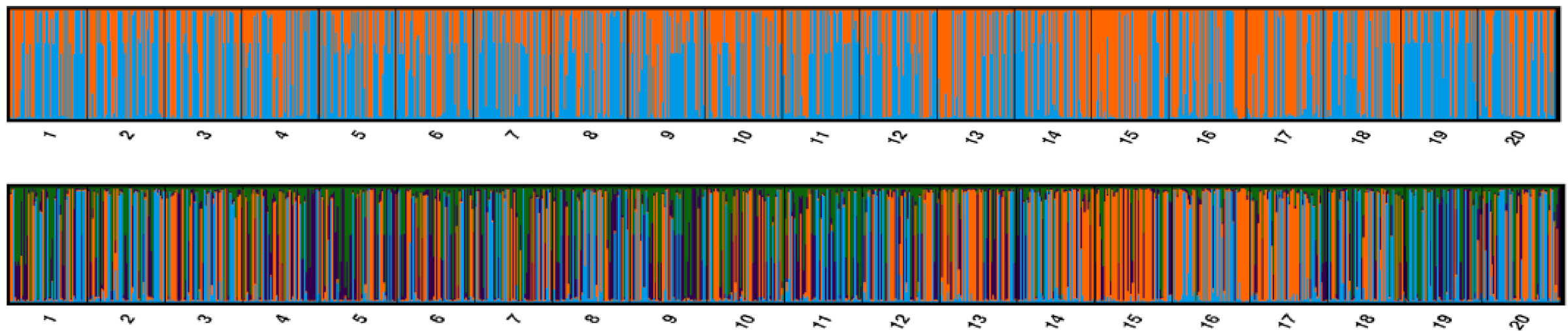 Durch das Programm wurde ein maximaler deltaK-Wert von rund 20,986 bei einem Gruppierungswert von 2 erreicht. Demnach können die 20 Populationen höchstwahrscheinlich in zwei Gruppen eingeteilt werden, jedoch ohne einen eindeutigen räumlichen Gradienten. Die nächste relevante Gruppierung wird bei einem deltaK = 8,524 und vier Clustern K = 4 definiert (Abb. 3).