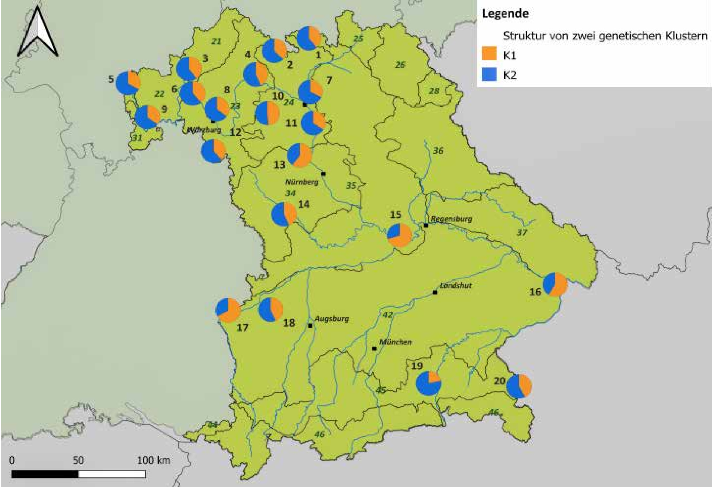 Die Ergebnisse der genetischen Distanz wurden anhand des paarweisen genetischen Abstands basierend auf Jost berechnet. Die Populationen (1 bis 12) im Norden Bayerns scheinen sich untereinander kaum zu unterscheiden. Im Gegensatz dazu weisen die Populationen im Süden eine gewisse genetische Distanz auf. Besonders der paarweise genetische Abstand bei den Beständen 13 und 19 fällt dabei auf.