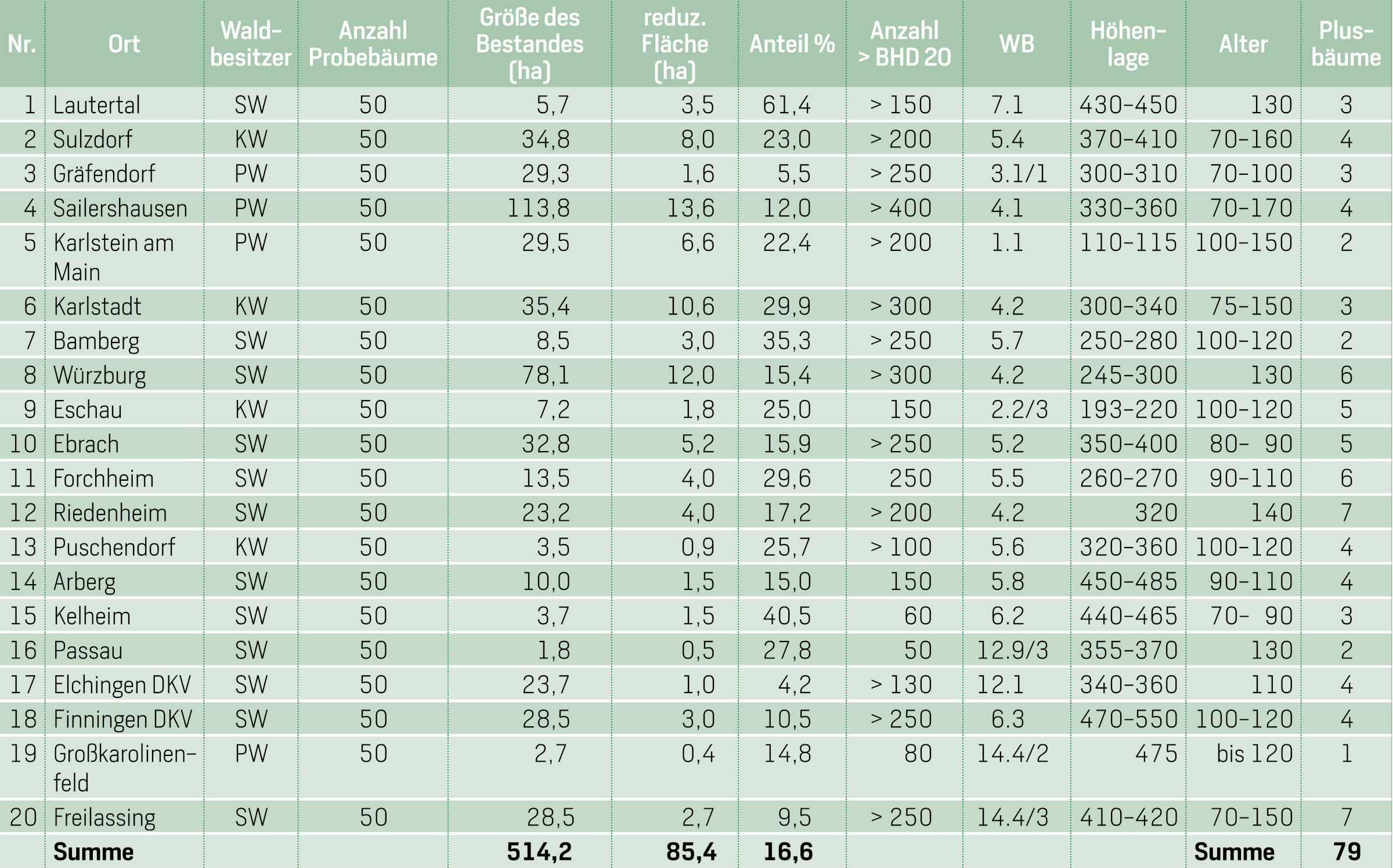 In bestimmten Wuchsbezirken (WB), in denen keine oder wenige Ernteeinheiten liegen, konnten neue Vorkommen gefunden und beprobt werden, wie z. B. Wuchsgebiet (WG) 5 Fränkischer Keuper und Albvorland: Hier konnte in Vorkommensgebieten ohne Erntebestände die Erntebasis bei der Hainbuche verbessert werden. Leider gibt es im ostbayerischen Bereich (HKG 03) noch eine unzureichende Ausstattung an Erntebeständen. Für eine mögliche Anlage einer ersten Samenplantage in Bayern konnten vorerst 77 Plusbäume ausgewählt werden (Tab. 1).