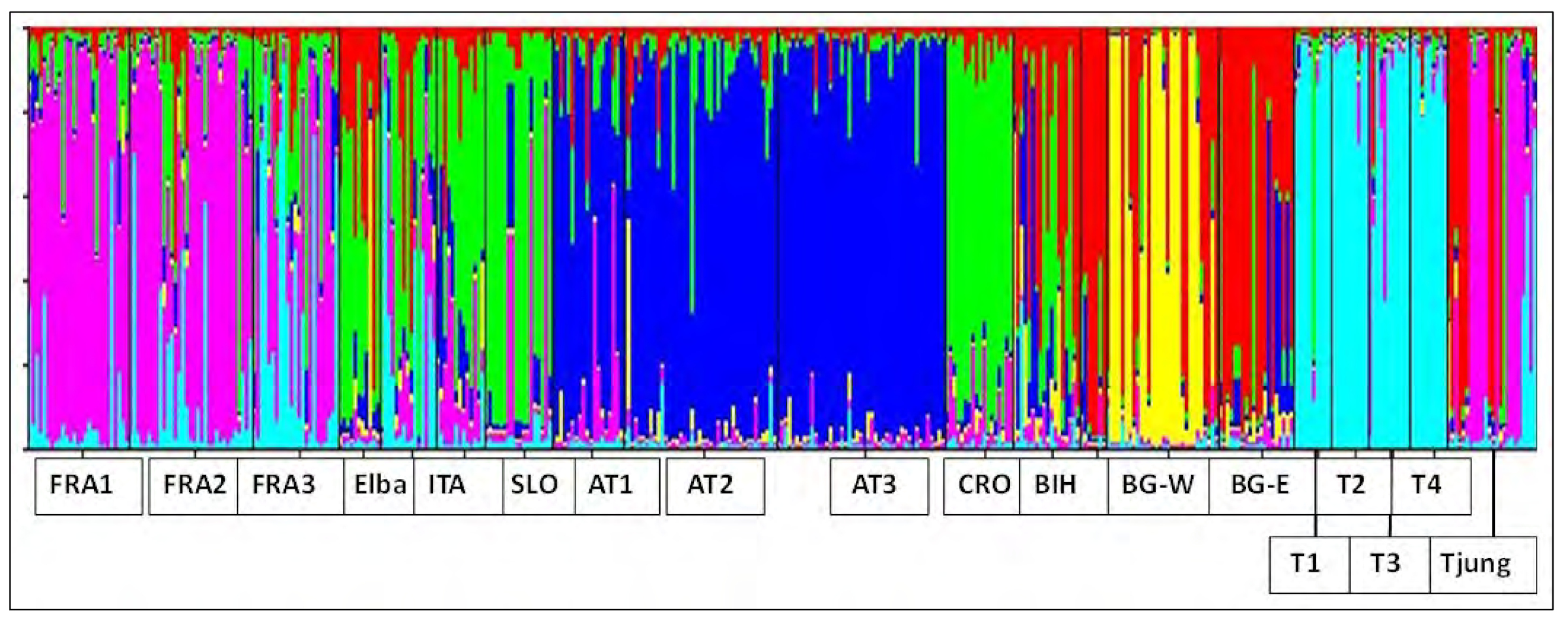 Abb. 3: Ergebnisse der auf individuellen Daten basierenden Zuweisung zu genetischen Gruppen mittels der Software STRUCTURE (PRITCHARD et al. 2000). Jede vertikale farbige Linie stellt die Wahrscheinlichkeit der Zuordnung zu einem bestimmten genetischen Cluster für ein Individuum dar, d.h. je signifikanter die Zuordnung eines Individuums zu einem Cluster umso „einfarbiger“ ist die jeweilige Linie. FRA – Frankreich, ITA – Italien, SLO – Slowenien, AT – Österreich, CRO – Kroatien, BIH – Bosnien-Herzegowina, BG – Bulgarien, T – Thüringen
