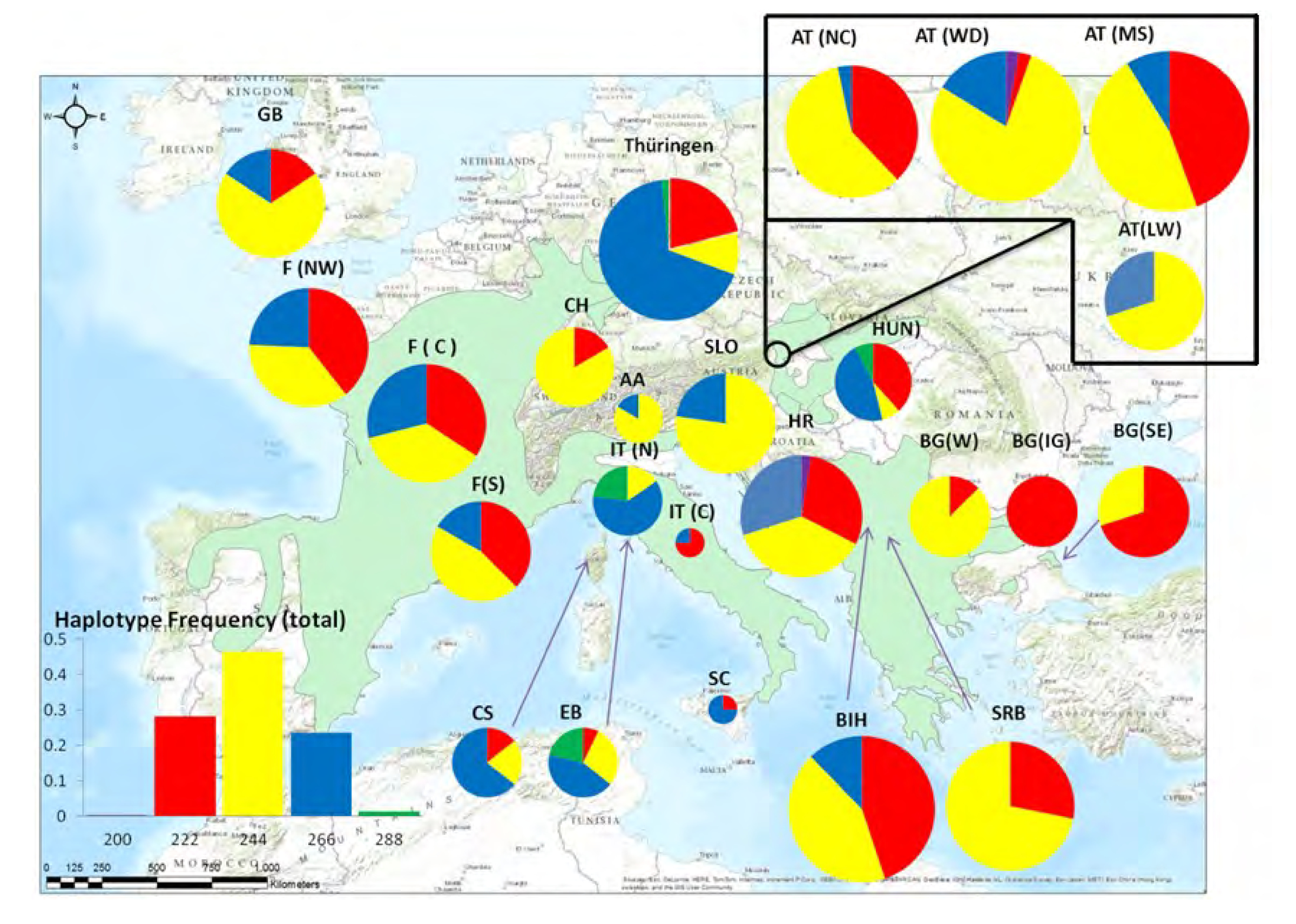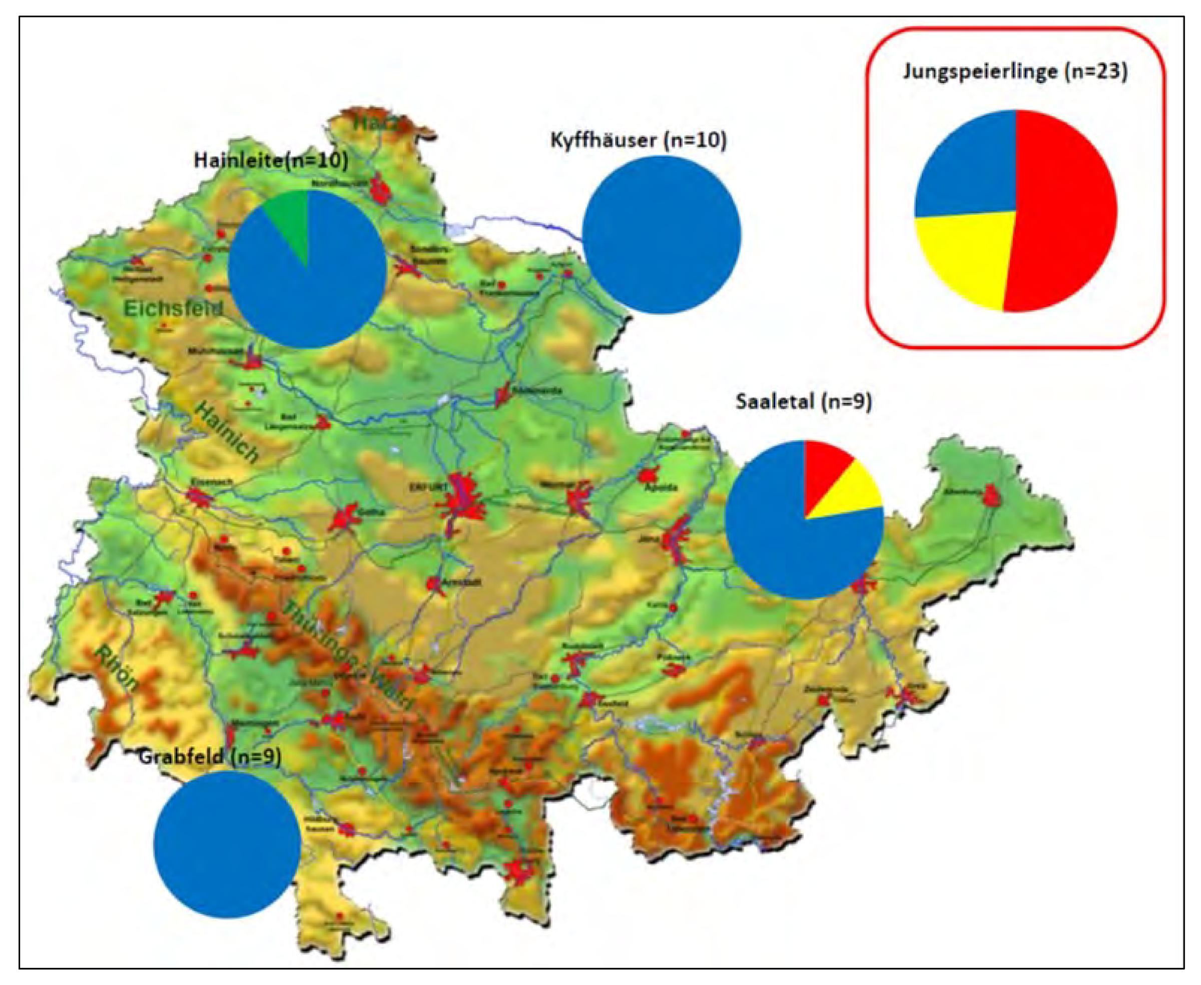 Während in allen untersuchten Populationen von Thüringer Altbäumen der Haplotyp 266 (blau) dominierte, stellte dieser in der Stichprobe der Jungspeierlinge nur den kleinsten Anteil. Insgesamt war die Haplotypendiversität in den Altbäumen (mit Ausnahme der Population "Saaletal") mit nur 1-2 Haplotypen sehr gering.