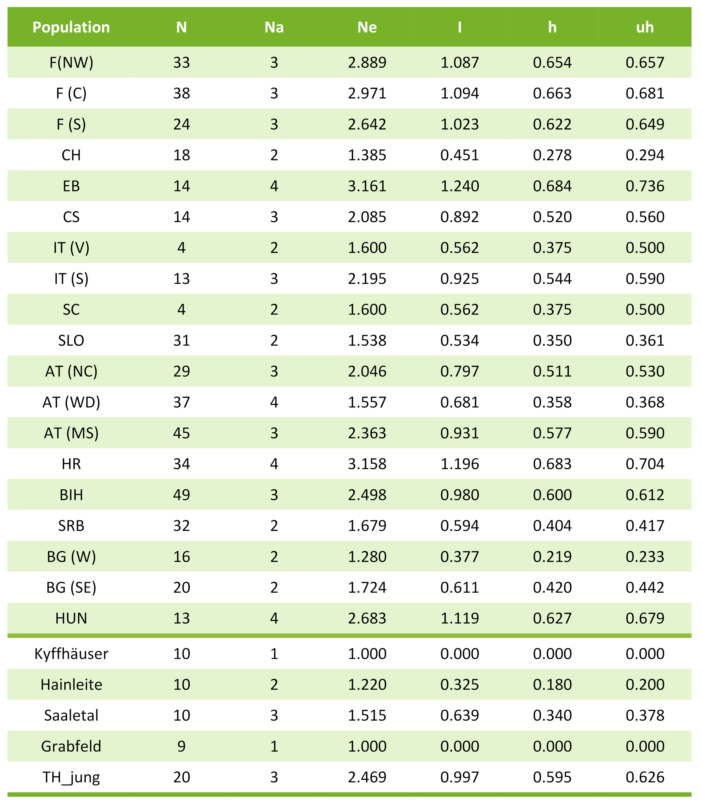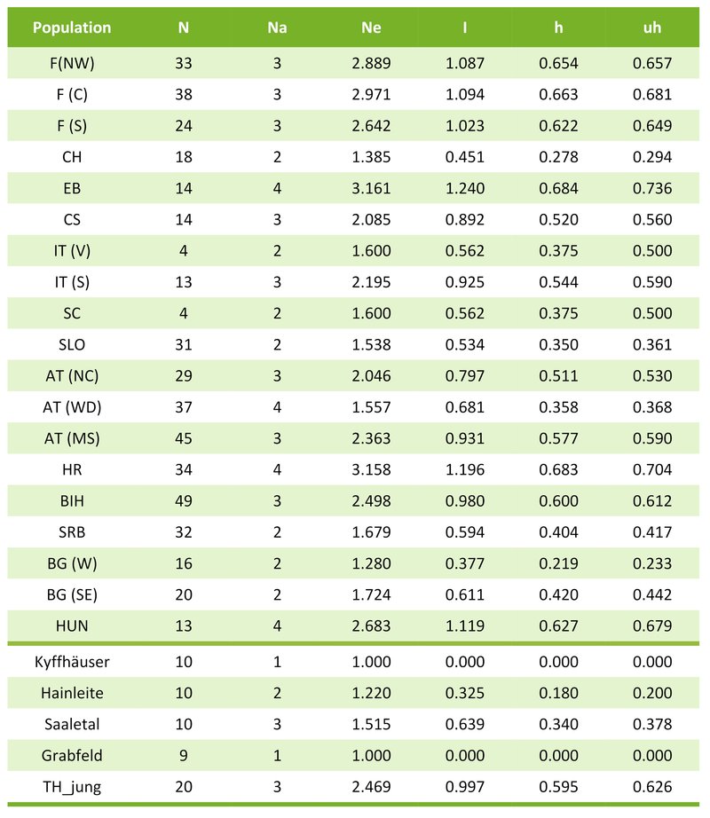 Tab. 1: Diversität von Sorbus domestica in Europa und in Thüringen: Anzahl Individuen (N); Anzahl Allele (Na); effektive Anzahl Allele (Ne); Information-Index (I); haploid diversity (h); unbiased haploid diversity (uh); F – Frankreich, CH – Schweiz, EB – Elba/Italien, CS – Korsika/Frankreich, IT – Italien, SC – Sizilien/Italien, SLO – Slowenien, AT – Österreich, HR – Kroatien, SRB – Serbien, BIH – Bosnien-Herzegowina, BG – Bulgarien, HUN –Ungarn, T – Thüringen