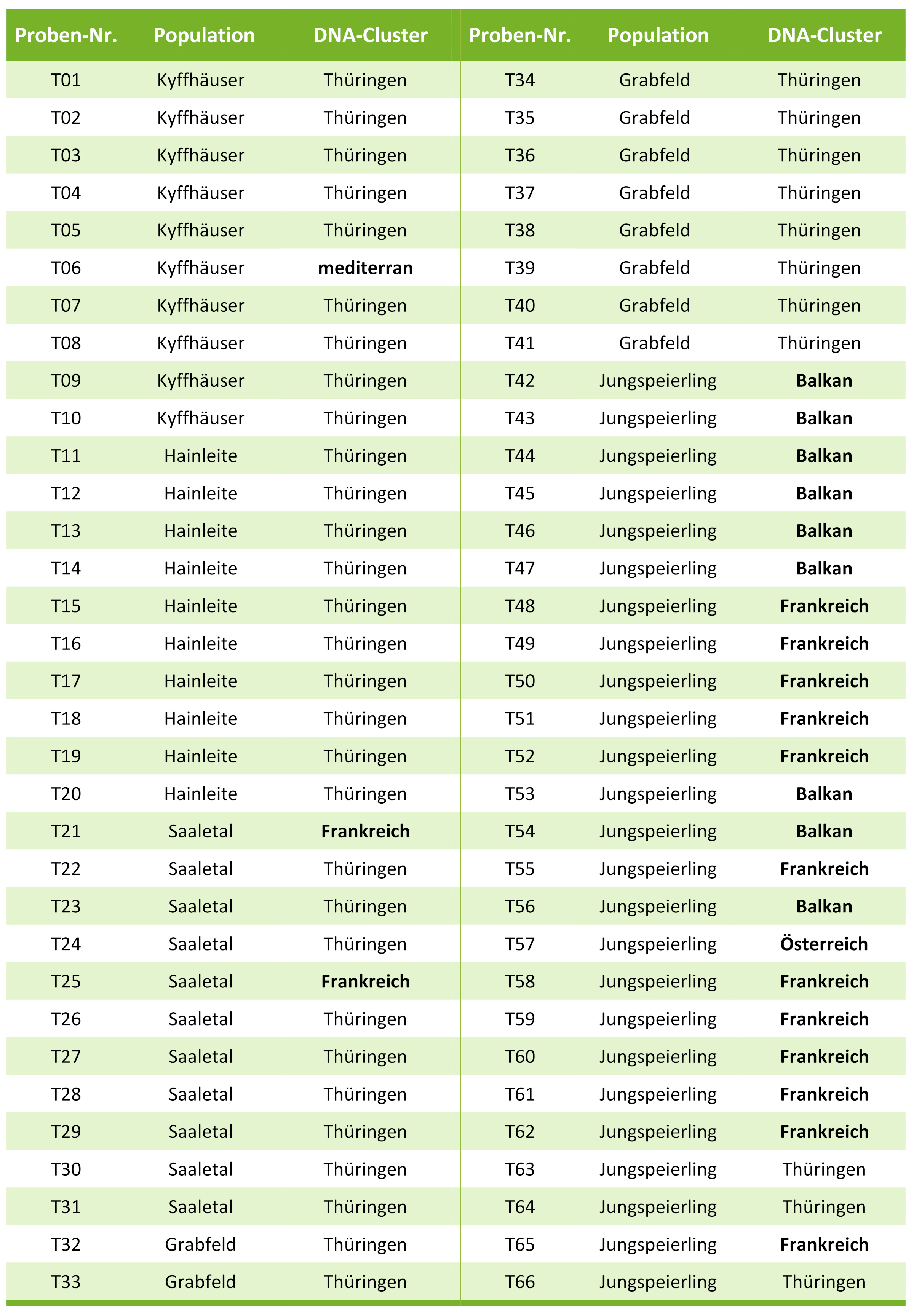 Abschließend kann gesagt werden, dass die gewonnen Ergebnisse eine überaus interessante Bereicherung unseres Wissensstandes über die Art darstellen. Die Thüringer Population zeigt Hinweise auf natürliche Entstehung und könnte so die nördliche Verbreitungsgrenze der Ausbreitung der Art nach Nordosten hin zeigen. Eine genetische Einengung an einer solchen Front, die theoretisch wahrscheinlich wäre, ist aber nicht zu erkennen, sondern sogar eher das Gegenteil davon. Die Art ist daher in Thüringen absolut erhaltungs- und schützenswert, die Verwendung von einheimischem Vermehrungsgut sollte auf jeden Fall gefördert werden.
