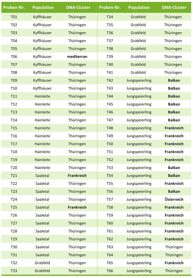 Insgesamt deuten die vorliegenden Ergebnisse darauf hin, dass die alten Speierlinge in Thüringen längere Zeit von anderen Vorkommen isoliert waren, andererseits sich aber auch (mehr oder weniger) natürlich vermehren konnten, da die Populationsstruktur der Altspeierlinge nur sehr wenige Abweichungen vom natürlich zu erwartenden Muster zeigten (nur geringe Abweichungen vom Hardy-Weinberg-Gleichgewicht). Nur wenige der Altbäume stammen aus anderen Regionen, etwa Frankreich und dem mediterranen Raum (Tab. 3).