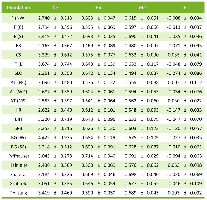 Tab. 2: Populationsdiversitätsindices (+/- Standardabweichung) aus den nuklearen Mikrosatellitendaten (7 Loci). Ne, Anzahl effektive Allele; Ho, beobachtete Heterozygotie; uHe, um die Stichprobengröße korrigierte erwartete Heterozygotie; F, Fixationsindex