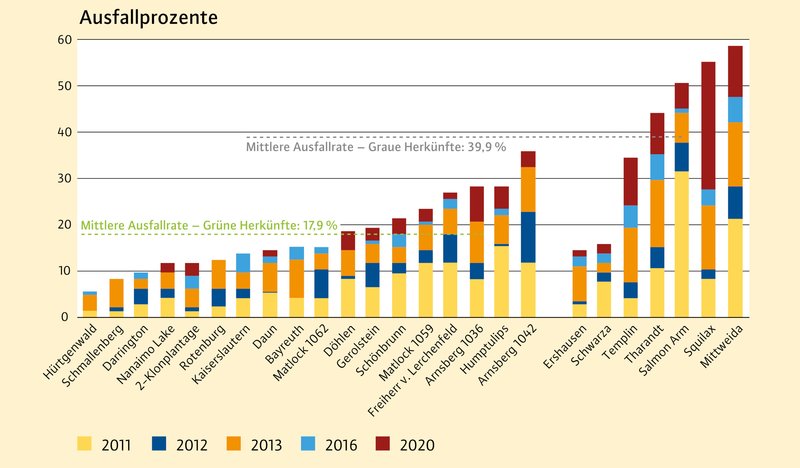 Bis zum Alter 14 fielen im Mittel aller Herkünfte 23,6 % der Versuchspflanzen aus (Abbildung 3). Signifikante Unterschiede waren zwischen grünen und grauen Herkünften zu beobachten: Mit durchschnittlich 39,3 % waren die Ausfälle bei den grauen Herkünften mehr als doppelt so hoch wie bei den grünen Provenienzen. Bei der grauen amerikanischen Herkunft "Squilax" nahmen die Verluste auch in der Stangenholzphase noch stark zu. Bei den grünen Herkünften lag die Ausfallrate im Mittel bei 17,9 %. Verluste unter 10 % verzeichneten die Herkünfte "Hürtgenwald", "Schmallenberg" und "Darrington".