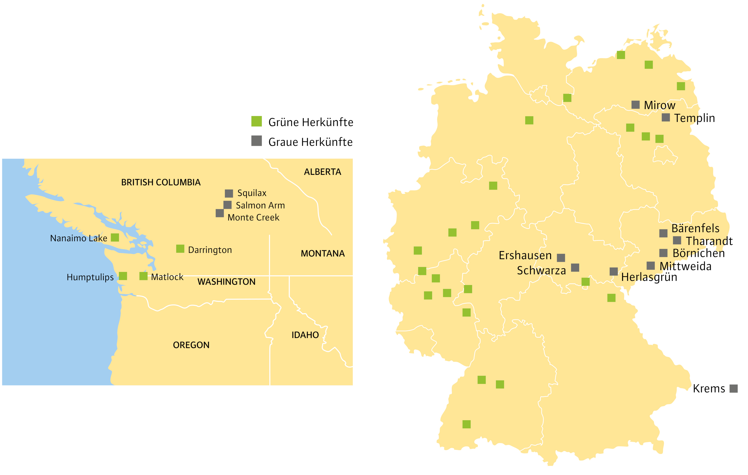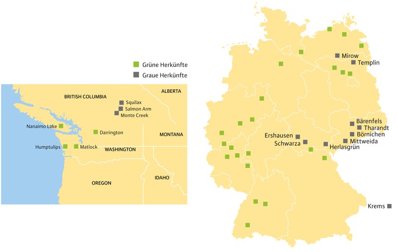 Im Frühjahr 2006 wurden Herkünfte aus zahlreichen deutschen Douglasienbeständen, aus drei heimischen Samenplantagen sowie aus sieben amerikanischen Saatgutbeständen ausgesät (Abbildung 2). Die Zuordnung der Herkünfte zu den Varietäten sicherte man dabei mit biochemisch-genetischen Labormethoden ab.