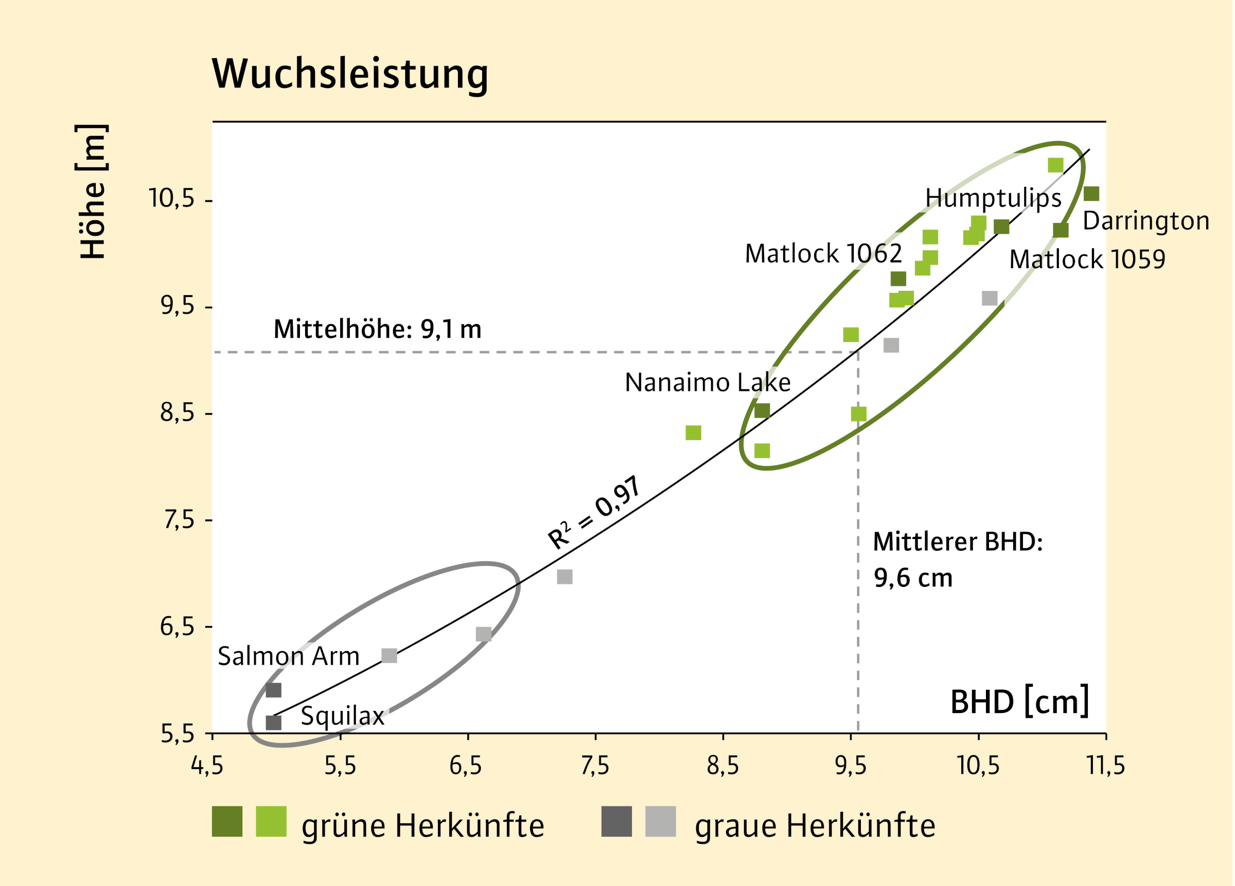 Die grünen amerikanischen Provenienzen liegen hinsichtlich ihrer Leistung fast durchweg an der Spitze aller Herkünfte. Die Wüchsigkeit der grünen Herkünfte aus Deutschland streuen dagegen in einem breiten Rahmen – ein Hinweis, dass es sich möglicherweise nicht um reinrassige Erntebestände handelt. Diese Beobachtung kann aber auch auf das Vorhandensein von kleinräumig ausgeprägter Differenzierung in Teilpopulationen innerhalb der Vorkommensgebiete der Küstendouglasie zurückzuführen sein.