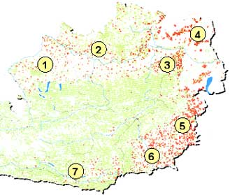 Abbildung 1: Eichenvorkommen in Österreich und mögliche Lage der Versuchsflächen (1 – 7) (rot = Eichenvorkommen; grün= Wald, andere Arten; Quelle: SCHADAUER 1995)