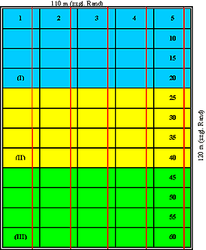 Für 60 Parzellen werden 1,32 ha Fläche benötigt (Abb. 2). Hinzu kommt ein weiterer Flächenbedarf für ein oder zwei Randreihen zur Minderung von Randeffekten. Damit beläuft sich die Gesamtfläche einer Versuchsanlage auf etwa 1,5 ha. Wenn die Geländeverhältnisse es erfordern, kann der Versuch auch in zwei oder drei Teilflächen angelegt werden.
