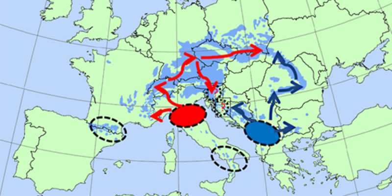 Die Weißtanne hat die letzte Eiszeit in mindestens vier verschiedenen Refugien überdauert. Eines dieser Refugien befand sich in den Pyrenäen, ein weiteres im südlichen Apennin, ein drittes im nördlichen Apennin sowie ein viertes auf der südlichen Balkanhalbinsel (Abb. 1a). Die Rückwanderung der Tanne nach dem Abschmelzen des Eisschildes in ihr heutiges Verbreitungsgebiet erfolgte jedoch vorwiegend aus dem nördlichen Apennin und dem südlichen Balkan, während die Vorkommen in den Pyrenäen und im südlichen Apennin lange Zeit isoliert blieben.