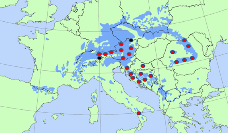 Abb. 1b: Herkünfte (rote Punkte) und Versuchsflächen (schwarze Punkte), welche im Rahmen des Tannenherkunftsversuches am Institut für Waldgenetik getestet werden sollen. Der blau unterlegte Bereich deutet die heutige Verbreitung der Weißtanne an. Hintergrundkarte: EUFORGEN