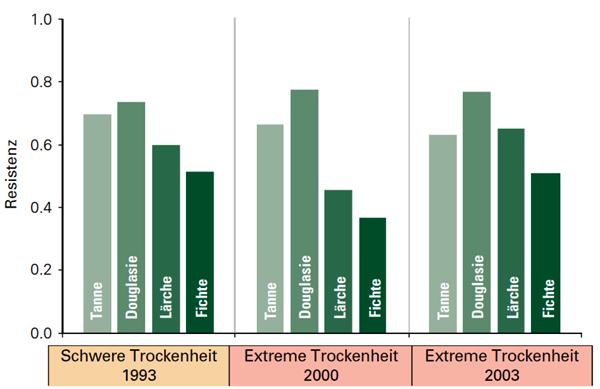 Abb.2: Trockenresistenz der Tanne im Vergleich zu Fichte, Lärche und Douglasie. Resistenz ist hier ausgedrückt als Radialzuwachs während des Trockenjahres im Verhältnis zum 3-jährigen Vorjahresdurchschnitt (Beispiel: Resistenz=0.6 -> 60% des Vorjahreszuwachses konnten während des Trockenjahres noch realisiert werden.