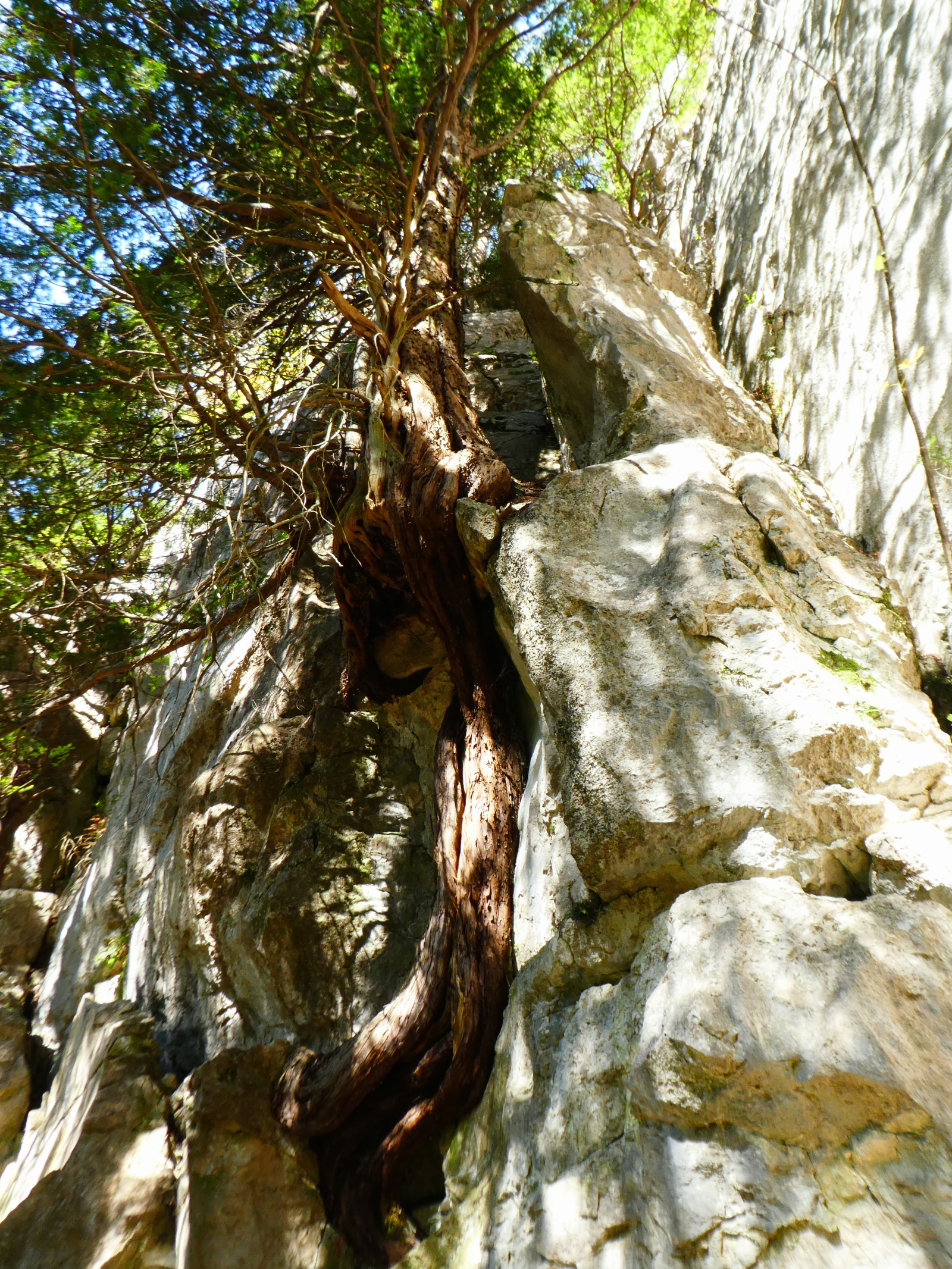 In Forstrevieren, in denen der Jagddruck bekanntermaßen hoch ist, findet man ausreichend Verjüngung der natürlich vorkommenden Baumarten und der Tanne. Die dunkleren Verjüngungszonen der Tanne sind mit zahlreichen Eiben durchsetzt, die im Höhenwuchs mit der Tanne noch mithalten können. Auf den meisten anderen Untersuchungsflächen können vorhandene Eibensämlinge nur groß werden, wenn sie auf Sonderstandorten wachsen, die vom Schalenwild nicht erreicht oder gemieden werden wie z. B. Felsen, Spalten, steile Bereiche, Wanderwege oder Quellaustritte (Tuffgestein, s. Abb. 4).