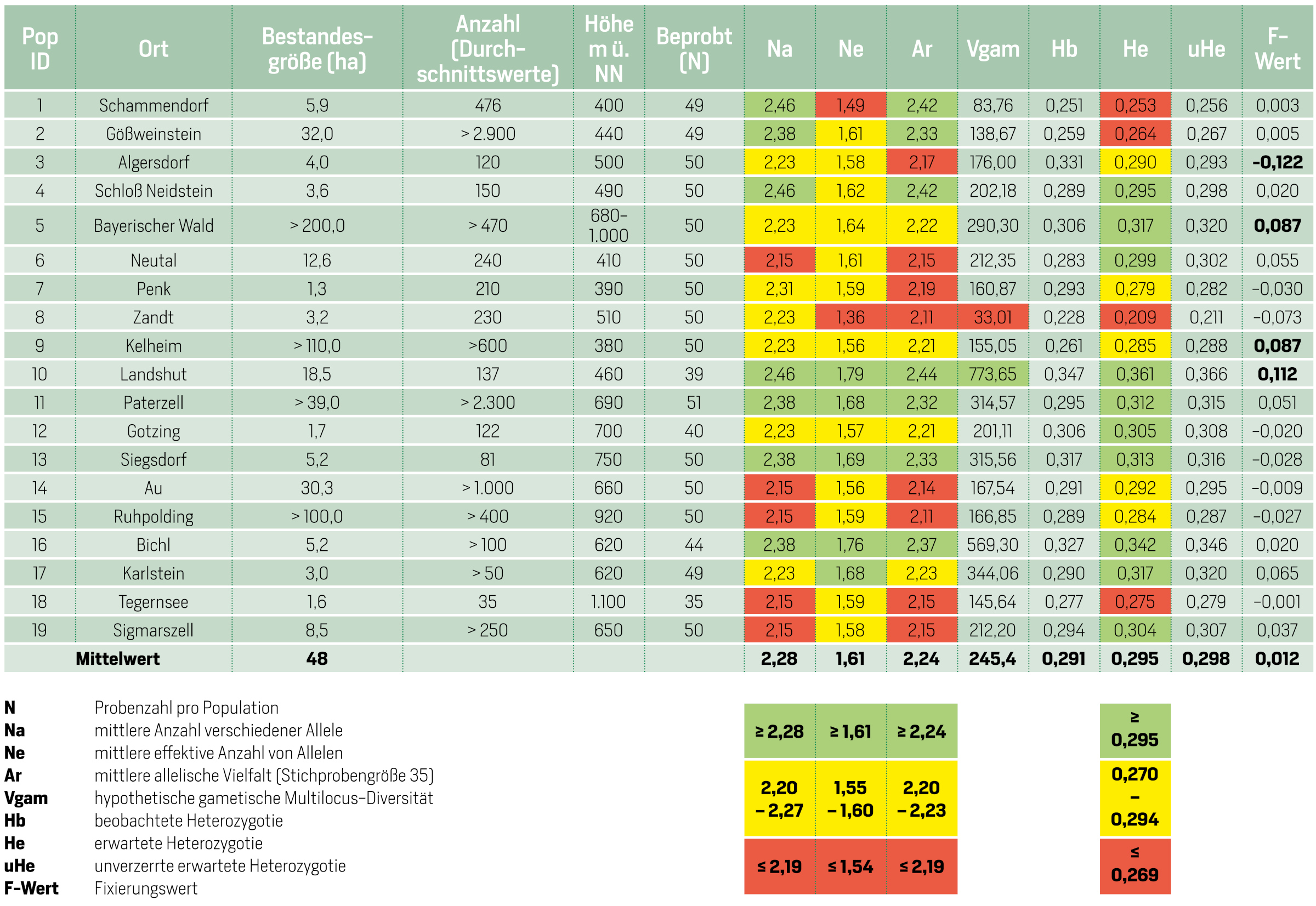 Die genetische Vielfalt, d. h. die mittlere Anzahl der Genvarianten je Genort, variiert in den Eibenvorkommen zwischen 2,15 (6 = Neutal; 14 = Au; 15 = Ruhpolding; 18 = Tegernsee; 19 = Sigmarszell) und 2,46 (1 = Schammendorf; 4 = Schloss Neidstein; 10 = Landshut; s. Abb. 5). Diese Unterschiede sind als nicht sehr hoch einzuschätzen. Auch die mittlere Anzahl von Allelen (Ne) ist zwischen 1,36 (8 = Zandt) und 1,79 (10 = Landshut) nur mäßig unterschiedlich. Demgegenüber ist die genetische Diversität mit einer Spreitung bei Vgam zwischen 33,01 (8 = Zandt) und 773,65 (10 = Landshut) stark unterschiedlich. Die F-Werte sind bis auf wenige Ausnahmen nahe Null, d. h., Inzuchteffekte können ausgeschlossen werden.