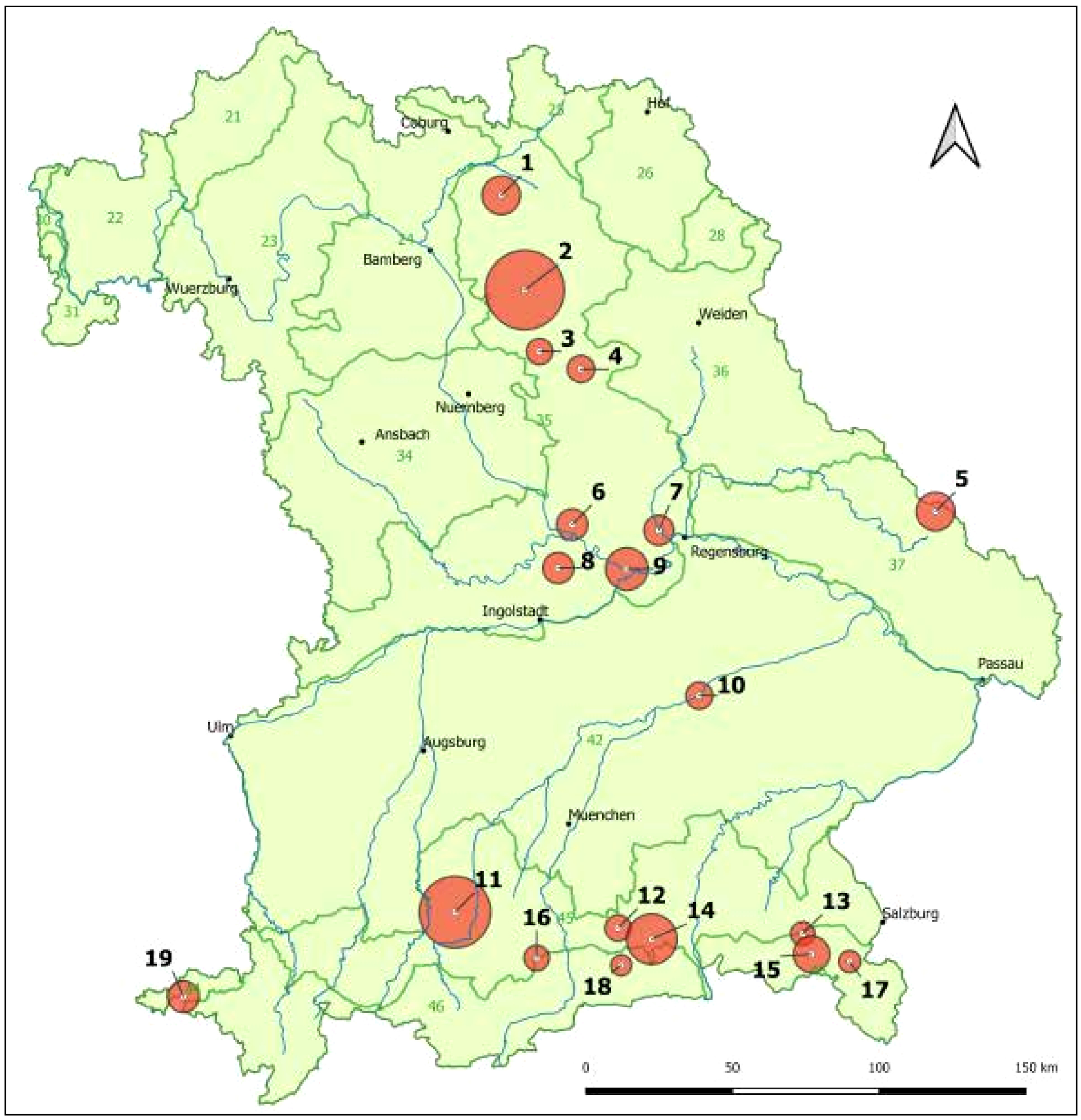 Im Rahmen des Projekts wurden 19 Eibenvorkommen für genetische Untersuchungen ausgewählt (Abb. 3). Die genetische Charakterisierung soll einen Überblick über die genetische Variabilität ermöglichen sowie räumlich-genetische Muster in Bayern aufzeigen. Daraus sollen Empfehlungen für Maßnahmen zur Erhaltung dieser bedrohten Baumart abgeleitet werden.