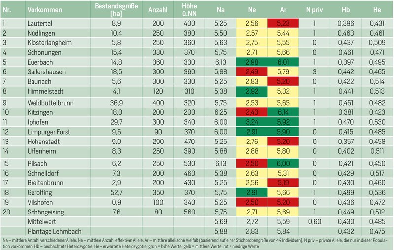 Die Samenplantage in Lehmbach liegt bei den meisten genetischen Diversitätsparametern leicht über den Durchschnittswerten der Bestände.