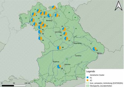 Die Gesamtverbreitung des Feldahorns in Europa ist kontinuierlich. Lokale Populationen variieren jedoch erheblich in Dichte und Größe. Daher ist ihre genetische Konnektivität oft gering. Das spiegelt sich auch in einer relativ hohen regionalen und überregionalen genetischen Differenzierung wider. Die Untersuchung der räumlich-genetischen Struktur ergab die optimale Anzahl an Clustern bei K=2 (Abb. 4.).
