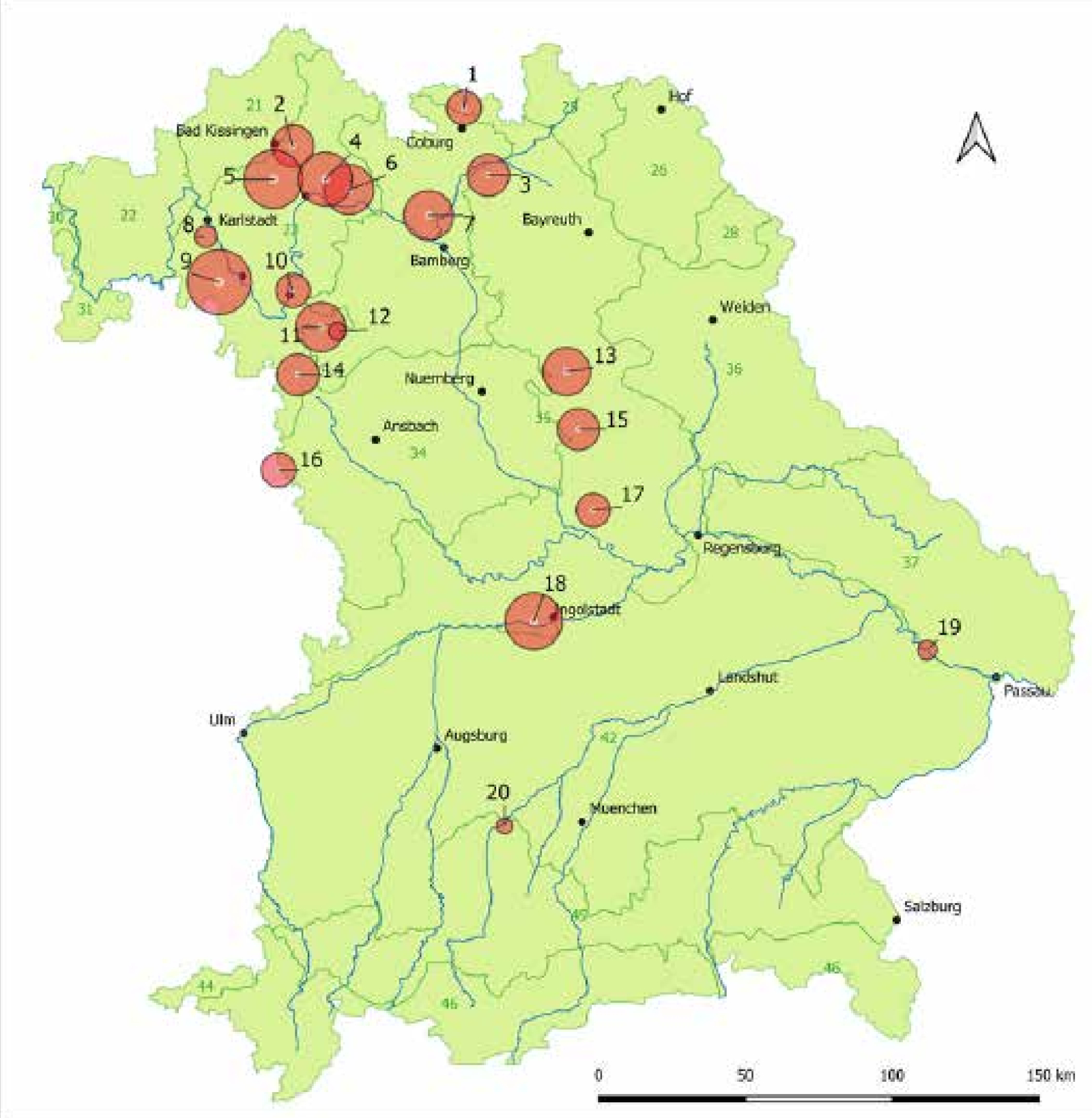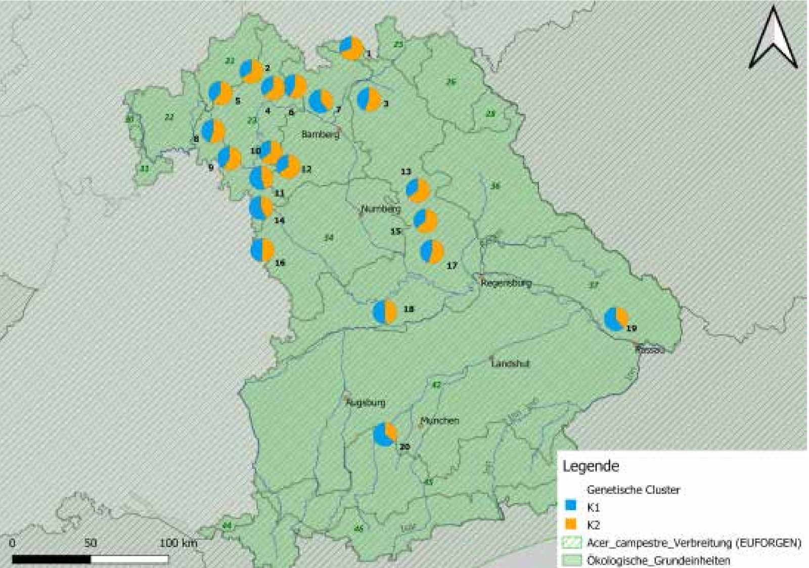 Abb. 4: Räumlich-genetische Strukturen in Bayern anhand der Kernmarke. Die Farbverteilungen K1 (blau) und K2 (orange) zeigen für die Vorkommen 7, 11, 14, 18, 19 und 20 einen höheren Anteil des blauen Clusters an. Quelle: Kartengrundlage: Bayerisches Landesamt für Umwelt, www.lfu.bayern.de, verändert nach Fussi et al.