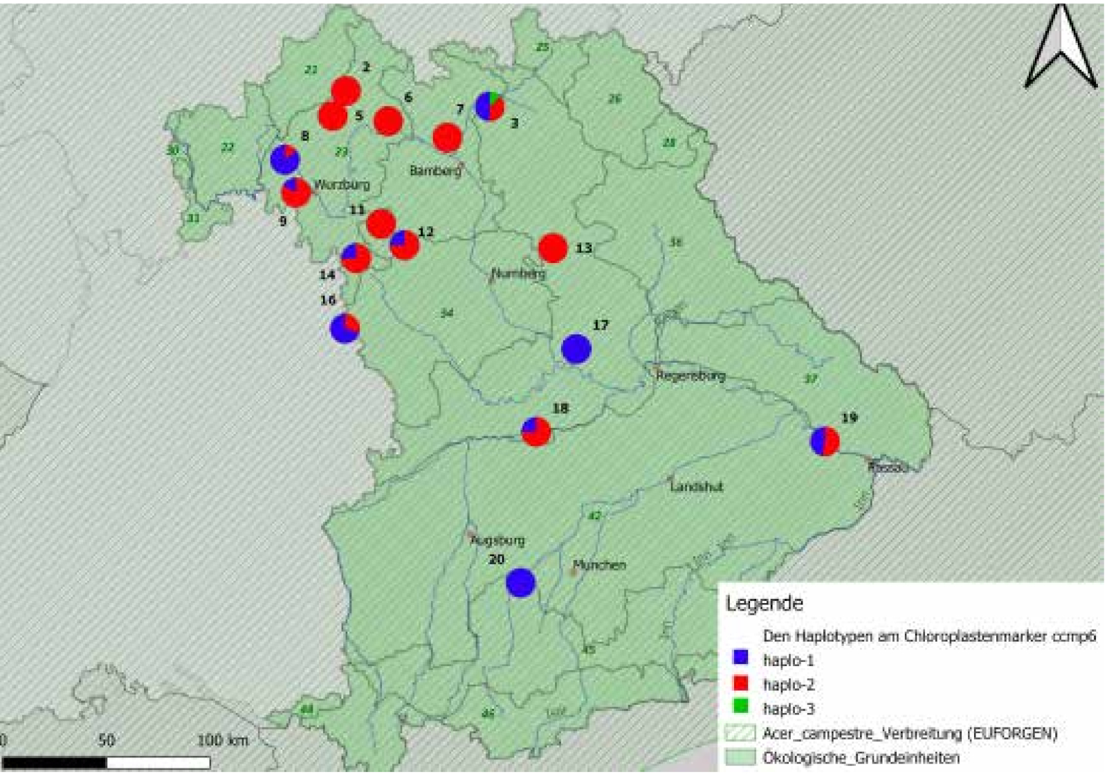 Studien zur genetischen Variation an mütterlich vererbten Chloroplastenmarkern über ganz Europa zeigen eine verhältnismäßig geringe genetische Variation. Einzelne Haplotypen dominieren dabei die Populationen. In Süddeutschland kommt es zur Vermischung von mehreren Haplotypen und damit zu einer vergleichsweise hohen genetischen Vielfalt. Ein ähnliches Bild war in den untersuchten bayerischen Feldahornbeständen zu finden. So wurden anhand des Markers ccmp6 insgesamt drei verschiedene Haplotypen gefunden (Abb. 5). Dabei überwiegen zwei Haplotypen (rot und blau), die, teilweise gemischt und teilweise einzeln in den Beständen auftretend, zufällig über das Untersuchungsgebiet verteilt sind. Bei einer Population (3-Klosterlangheim) kommt noch ein zusätzlicher Haplotyp (grün) vor. Bei Betrachtung der Ergebnisse aus beiden Markertypen kann für Bayern keine räumlich genetische Struktur abgeleitet werden. Daher wird für Bayern ein Herkunftsgebiet vorgeschlagen.