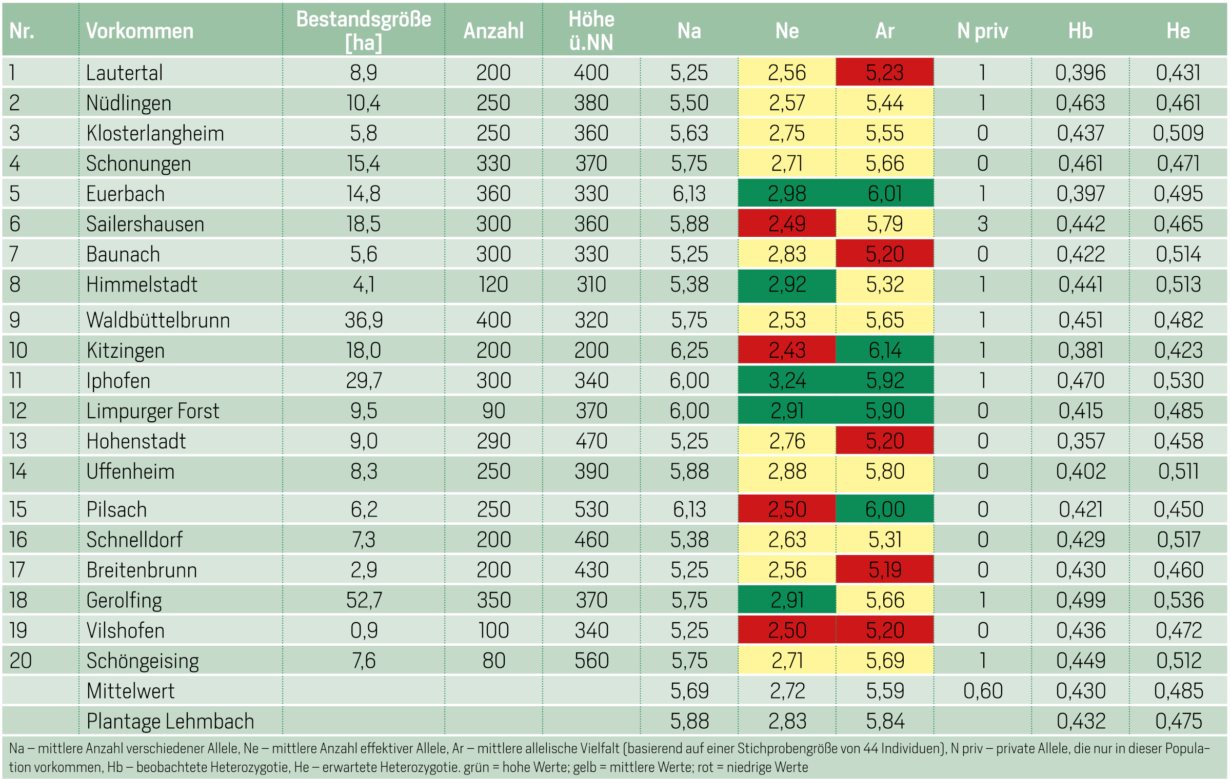 Bestände, mit einem überdurchschnittlichen Ne-Wert (über 2,9) sollten bevorzugt beerntet werden (in Abb. 2 grün markiert). Bestände mit Werten unter 2,5 sollten für eine Saatguternte nicht in Betracht gezogen werden. In Verbindung mit einer hohen allelischen Vielfalt und unter Berücksichtigung besonderer Vorgehensweisen könnten sie dennoch in die Nutzung miteinbezogen werden: