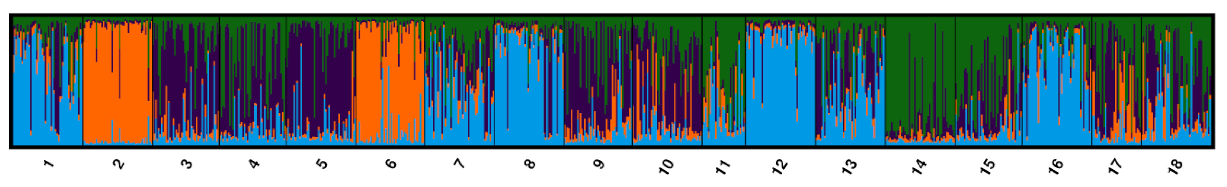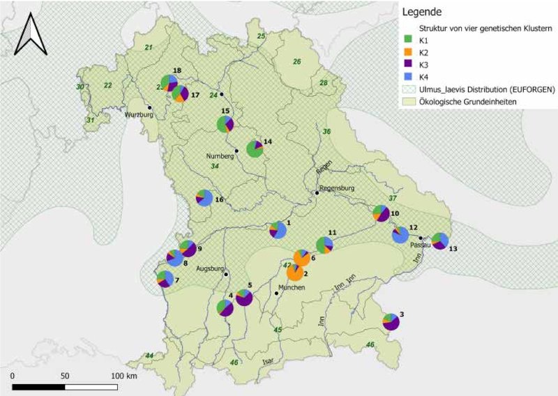 Die Analyse der molekularen Varianz (AMOVA) zeigte, dass 89 % der gesamten genetischen Variation innerhalb der Populationen und 11 % zwischen den Populationen zu finden waren. Vergleicht man diesen Wert mit Werten von untersuchten Populationen der Hauptbaumarten, ist der Wert fast doppelt so hoch und kann als erster Hinweis für eine Isolierung der einzelnen Populationen gewertet werden. Die Bayes’sche Clusteranalyse mit der Software STRUCTURE ergab eine mögliche Struktur von vier genetischen Clustern (höchstes Delta K von 6,5 lag bei K = 4, was auf vier genetische Gruppen hinweist) innerhalb der untersuchten Flatterulmenpopulationen in Bayern (Abb. 7). Dabei sind zwei größere Cluster (Main und Donau) mit mehreren Populationen vertreten und zwei kleinere, die an Nebenflüssen der Donau vorkommen, identifiziert worden. Nach dieser Einteilung wird das erste Cluster K1 (höchster Anteil an grün) hauptsächlich im Norden Bayerns identifiziert (fünf Populationen). Die meisten Populationen, die diesen Cluster bilden, können dem Flusssystem des Mains zugeordnet werden. Das zweite große Cluster K4 (höchster Anteil an blau) wurde in zentralen Teilen von Bayern entlang der Donau gefunden (sechs Populationen). Die zwei Sub-Cluster (K2 und K3) waren unausgewogen verteilt (höchster Anteil von orangem K2 und größter Anteil von violettem K3) und wurden in der Nähe der Donau oder im Süden Bayerns identifiziert. In allen untersuchten Populationen wurde jedoch eine Beimischung von anderen genetischen Clustern gefunden (Abb. 8).