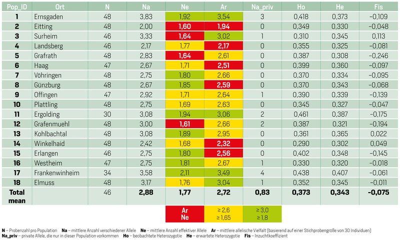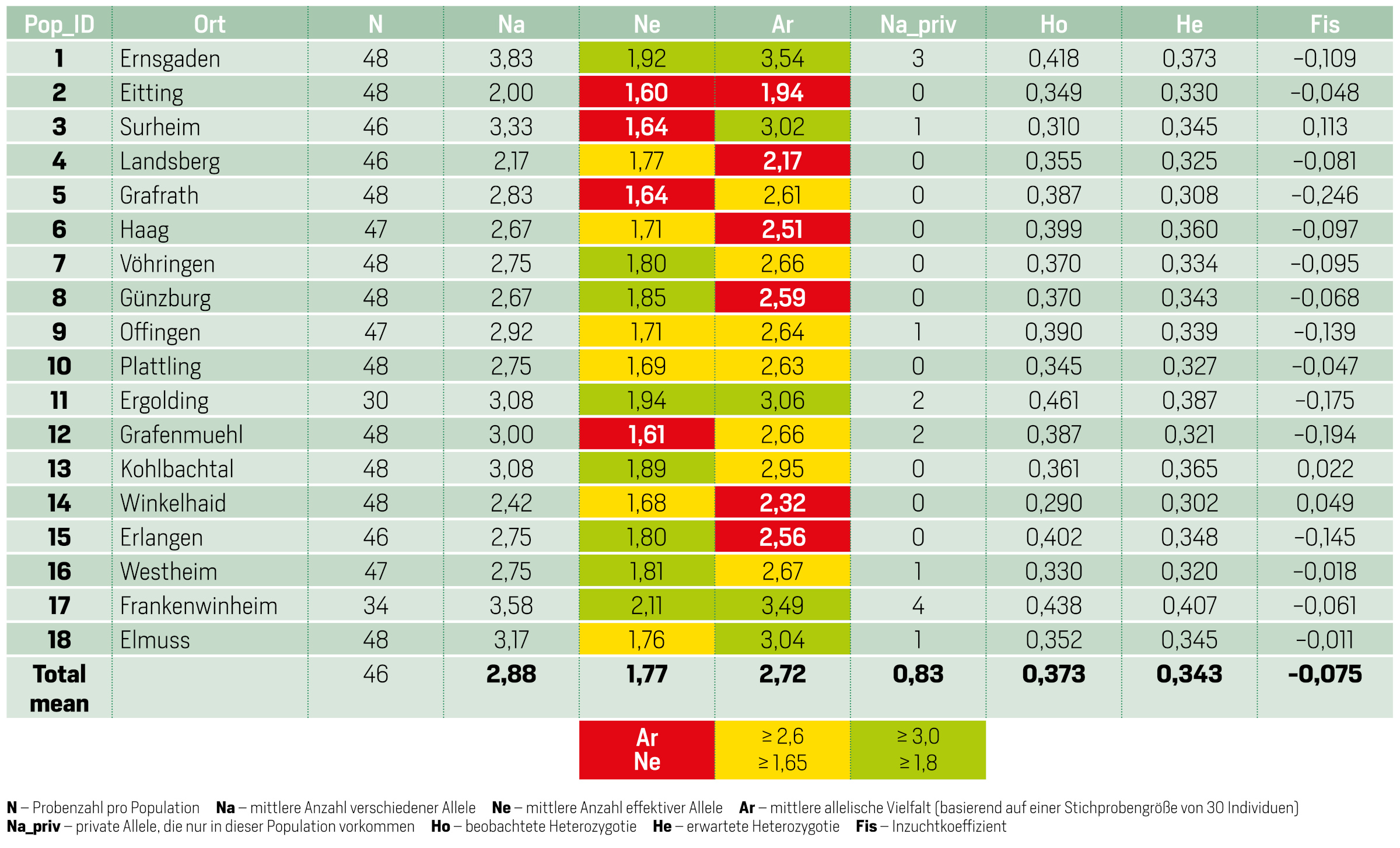 Für die Ausweisung von Saatguterntebeständen wird die mittlere Anzahl an effektiven Allelen Ne herangezogen. Dieser Wert steht für die genetische Diversität innerhalb einer Population und bezieht die Häufigkeitsverteilung der Allele mit ein. Die untersuchten Populationen wurden in drei Kategorien eingeteilt. Populationen der Flatterulme, die einen Wert von über 1,8 aufweisen, werden als besonders geeignet für eine Beerntung eingestuft (acht Populationen). Populationen mit einem Wert von 1,65 bis 1,8 werden als geeignet bewertet und können als Erntebestände genutzt werden (sechs Populationen). Populationen mit einem Wert unter 1,65 werden als ungeeignet eingestuft und sollten nur in Ausnahmenfällen beerntet werden. Bei einer günstigen Kombination der genetischen Diversität Ne und der allelischen Vielfalt Ar kann bei einer Auswahl von mindestens 30 Bäumen, die über das ganze Vorkommen verteilt sind, eine Saatguternte durchgeführt werden. Bei den untersuchten Populationen trifft das nur bei dem Vorkommen "3-Surheim" zu. Die drei Populationen, die im Rahmen dieser Erhebung von den zuständigen Revierleitern als Pflanzungen angegeben wurden, weisen alle bei den genetischen Parametern (Ne und Ar) geringe Werte auf. Für die Beerntung von seltenen Baumarten wird daher folgende Priorisierung vorgenommen: