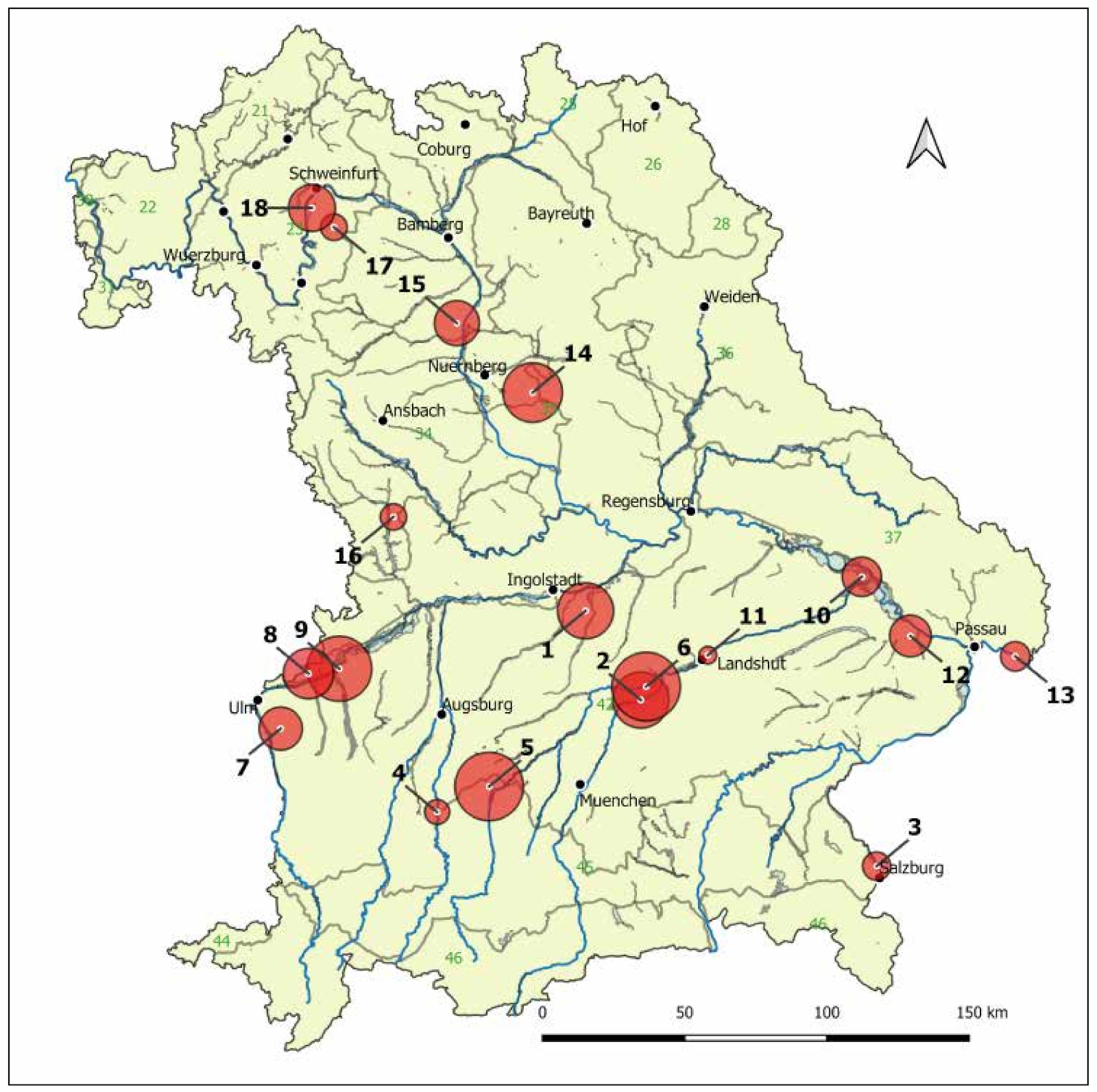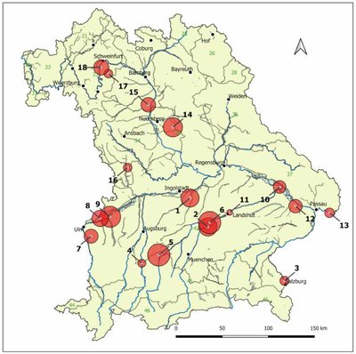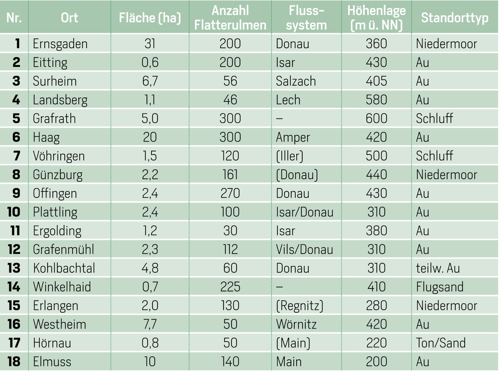 Nach Hochwasserereignissen herrschen diese speziellen Rohbodensituationen, die die Flatterulmensamen zum Keimen benötigen ("Katastrophenkeimer"). Durch Verbauungen, Begradigungen oder weitere Störungen gehen diese wichtigen Standortbedingungen verloren und somit auch die Möglichkeiten für die Flatterulme, sich zu verjüngen und zu verbreiten. Im Rahmen des Projekts P34 wurden 18 größere Flatterulmenvorkommen in Bayern ausgewählt und genetisch analysiert. Um eine sogenannte genetische Landkarte zu erstellen und für nachfolgende Bewertungen eine gute Grundlage zu schaffen, wurden im Hauptverbreitungsgebiet in Abhängigkeit von der Flächengröße rasterförmig und repräsentativ Beprobungen durchgeführt (Abb. 6). Die genetische Analyse kann Aussagen darüber treffen, ob sich bestimmte Vorkommen als Erntebestände oder auch als Generhaltungsbestände eignen. Deshalb kamen bei der Vorauswahl der Bestände folgende Auswahlkriterien zum Einsatz: