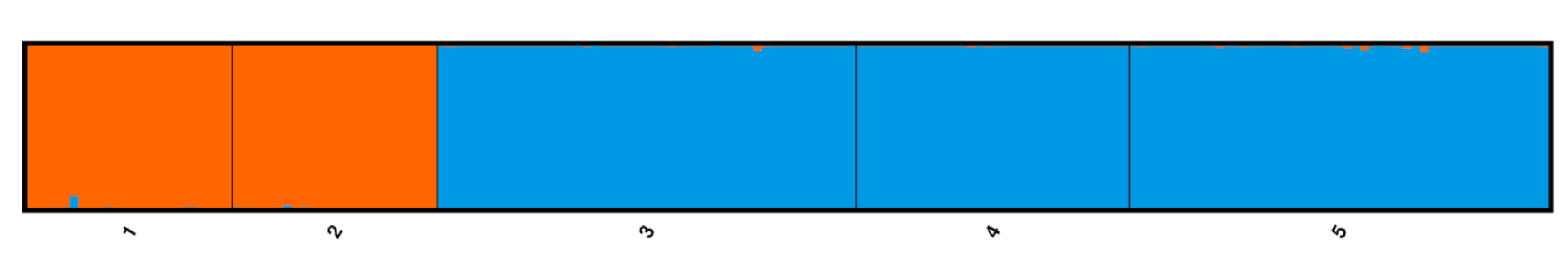 Genetische Differenzierung: Für die Auswahl geeigneter Vorkommen ist eine eindeutige Artbestimmung notwendig. Die Extraktion der DNA erfolgte aus Blättern nach der CTAB-Methode. Die genetischen Marker zur Artidentifizierung der Flatterulme wurden im Labor des Bayerischen Amts für Waldgenetik (AWG) etabliert. In einem ersten Schritt wurden 178 Proben (130 Flatterulmen aus drei Beständen, 24 Bergulmen einer Samenplantage, 24 Feldulmen aus einem Bestand) mittels 17 Kernmikrosatellitenmarker aus bereits existierenden Datenbanken getestet. Elf davon können für die Charakterisierung der Flatterulmenbestände und neun für die Artbestimmung verwendet werden. Mithilfe der Software STRUCTURE 2.3.4 wurde eine Bayes’sche Clusteranalyse der fünf Ulmenvorkommen durchgeführt und mittels der Software CLUMPAK dargestellt. Die Ergebnisse zeigten eindeutig zwei Cluster. Ein Cluster wird von den Berg- und Feldulmen (orange Felder, Abb. 5) und ein zweites Cluster von den Flatterulmen (blaue Felder) gebildet. Somit kann die Flatterulme genetisch eindeutig bestimmt werden. Die Berg- und Feldulme sind näher miteinander verwandt und werden bei der Annahme von zwei Genpools einem gemeinsamen Genpool zugeordnet. Für die Unterscheidung dieser beiden Arten sind zusätzliche Genmarker notwendig. Die phänotypisch und genetisch als Flatterulmen eingestuften Proben werden in weiterer Folge für die Charakterisierung der ausgewählten Vorkommen verwendet. Zusätzlich können die Marker im Rahmen der Herkunftskontrolle zur Artbestimmung verwendet werden.