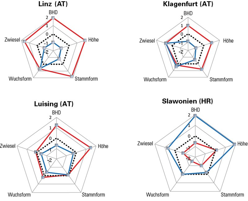 Abbildung 1: Wuchseigenschaften (Höhe, BHD) und Formeigenschaften (Stamm, Wuchs, Zwiesel) von vier Stieleichenherkünften im Herkunftsversuch. Die gepunktete Linie stellt den Mittelwert (Wert 0) über alle 22 Herkünfte auf den fünf Standorten dar. Rote Linie: Abweichung vom Mittelwert; Blaue Linie: Varianz der Werte über die fünf Standorte. Herkünfte Linz und Klagenfurt zeigen überdurchschnittliche Werte in allen fünf Merkmalen bei gleichzeitig geringer Variation zwischen den Versuchsstandorten, wobei die Herkunft Slawonien ein umgekehrtes Bild abgibt. Die Herkunft Luising zeigt dafür nur überdurchschnittliche Werte beim Zuwachs.
