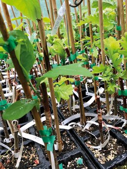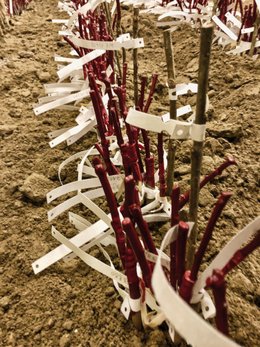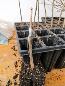 B) Von jedem Individuum (Klon) wurden Ende Februar 20 Edelreiser veredelt. Zum Schutz der Veredelung vor Austrocknung wurden sie in Veredelungswachs getaucht.
