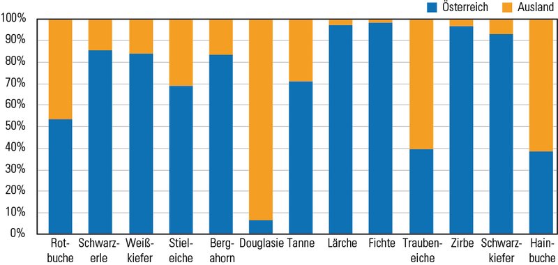 Abgesehen davon, dass es im Allgemeinen zu wenig Eichenpflanzgut auf dem Markt gibt, wurden die entsprechenden Saatguterntebestände (Linz, Klagenfurt oder Luising) selten beerntet oder im Verkauf angeboten. Importe aus dem Ausland federn den Mangel an heimischem Pflanzgut und die erhöhte Nachfrage ab, insbesondere bei der Traubeneiche (Abbildung 2).