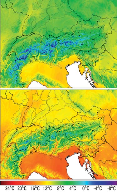 Abbildung 1: Herkunftsgebiete im Alpenraum heute (oben) und im Jahr 2080 (unten). Der Vergleich zeigt, dass Unterschiede zwischen dem Klima heute und in der Zukunft größer sind als zwischen benachbarten Herkunftsgebieten. Herkunftsversuche der Fichte im Alpenraum sind als Punkte eingezeichnet, allerdings wurden in der vorliegenden Arbeit ausschließlich österreichische Versuche berücksichtigt (Grafik modifziert)