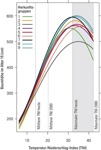 Abbildung 2 zeigt die Baumhöhe der Fichten im Alter 15 bei verschiedenen Werten eines Temperatur-Niederschlag-Index (TNI) in Österreich. Bei den heute in österreichischen Fichtenbeständen typischen Bedingungen (TNI = 13,5) sind die Unterschiede zwischen den Herkunftsgruppen nur gering. In warm-trockenen Gebieten (= höhere TNI-Werte), also am Rande der Fichtenverbreitung, zeigen sich dagegen enorme Unterschiede zwischen den Herkünften. Im Jahr 2080 werden diese auch in einem durchschnittlichen österreichischen Fichtenbestand bemerkbar sein. Insbesondere Herkünfte aus dem Wald- und Mühlviertel und dem südöstlichen Alpenrand erweisen sich unter zukünftigen Klimabedingungen wüchsiger als alpine Provenienzen.