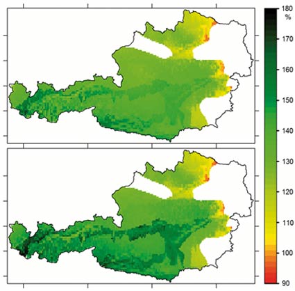Abbildung 3: Geschätze Zunahme der Fichtenproduktivität im Jahr 2080 in Abhängigkeit der Herkunftswahl. Oben: Ausschließliche Verwendung lokaler Herkünfte; unten: Bei Verwendung der produktivsten Herkünfte aus Österreich werden bis zu 11 % höhere Leistungen erzielt