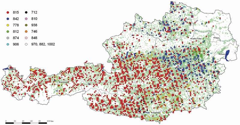 Haplotyp 842 kommt am zweithäufigsten vor, und zwar vor allem im Norden und Nordosten Österreichs. Dieser Haplotyp ist hauptsächlich zentraleuropäisch verbreitet und repräsentiert vermutlich ein Glazialrefugium im Bereich des Böhmerwaldes. Überraschend weit verbreitet ist auch Haplotyp 778; dieser kommt nicht nur im Süden und Südosten Österreichs (vermutlich natürlich) vor, sondern auch in Teilen der Kalkalpen und Tirols.