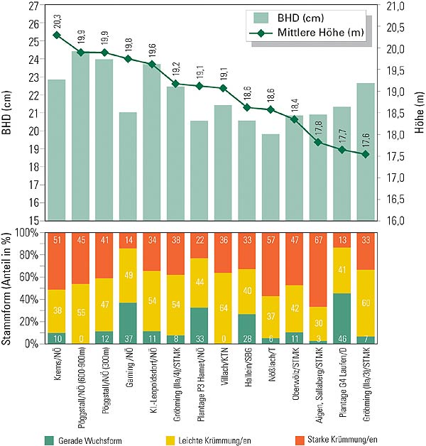 Die wüchsigsten Herkünfte mit Baumhöhen von rund 20 m im Alter von 26 Jahren stammen aus Krems (NÖ) und aus verschiedenen Seehöhen bei Pöggstall (NÖ). Dabei weisen die Herkünfte aus Pöggstall neben der überragenden Höhe auch einen überdurchschnittlichen BHD von etwa 24 cm auf. Am schwachwüchsigsten waren die Herkünfte Gröbming IIa/3 (Steiermark) und die Plantagenherkunft Laufen aus Deutschland mit Höhen von 17,6 m bzw. 17,7 m. Die Herkunft Nößlach (Tirol) hatte dagegen mit nur 18 cm den geringsten BHD.
