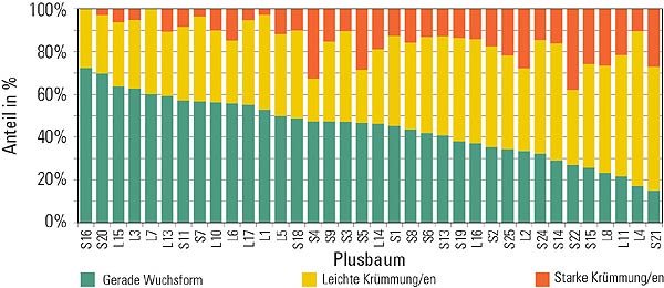 Der Anteil qualitativ hochwertiger Stämme kann zwischen den einzelnen Nachkommenschaften erheblich schwanken. Während die Klone S16, S20, L15 und L3 mehr als 60% gerade Stämme unter ihren Nachkommen aufweisen, finden sich unter den Nachkommen der Klone L4 und S21 weniger als 20 % der besten Stämme. Ähnlich große Unterschiede zwischen den Einzelklonen können auch bei der Wuchsleistung beobachtet werden.