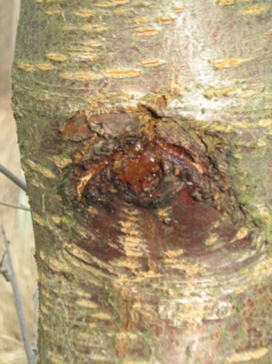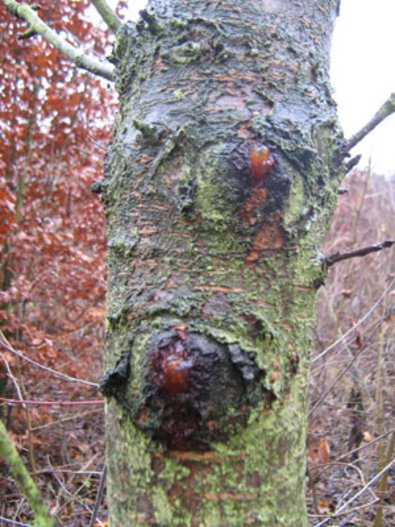 Der Gummifluss weist auf eine physiologische Störung des Baumes hin. Charakteristisch für dieses Schadbild ist der gummiartige, bernsteinfarbene Flüssigkeitsaustritt zwischen den Rindenschuppen, an Ästen und am Stamm. Als Auslöser dafür gelten Bakterieninfektionen (u.a. Pseudomonas syringae), Frost, Störungen im Wasserhaushalt, möglicherweise aber auch Verletzungen in Folge unsachgemäßer Wertastung.