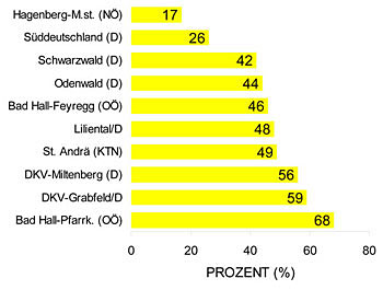 Mit hoher Wahrscheinlichkeit kann als herkunftsspezifische Ausfallursache das sommerwarme, durch geringe Niederschläge gekennzeichnete Klima im Weinviertel angesehen werden, insbesondere das Trockenjahr 2003. Bei der Weinviertler Herkunft Hagenberg-Mittersteig fielen nur 17 % der Pflanzen aus. Es folgen die Herkünfte Süddeutschland mit 26 % und Schwarzwald mit 42 %.