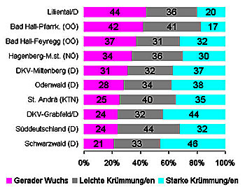 Gravierende Unterschiede lassen sich zwischen den Herkünften erkennen. Die Herkunft Liliental überzeugt mit 44 % gerade gewachsener Bäume. Auch die oberösterreichische Herkunft Bad Hall-Pfarrkirchen zeigt sich mit 42 % geraden Stämmen (22 von 52 Bäumen) als sehr formschön. Als wenig geradwüchsig stellten sich die Herkünfte Schwarzwald (21 %), Süddeutschland (24 %), Grabfeld (24 %) und die Herkunft St. Andrä (25 %) heraus (Abbildung 2).