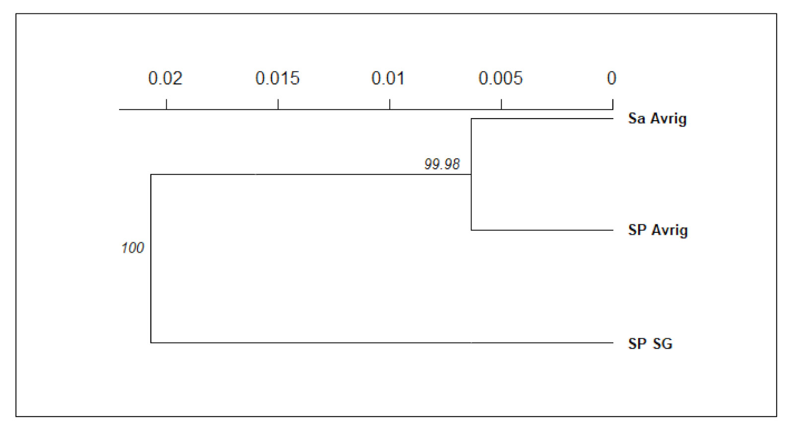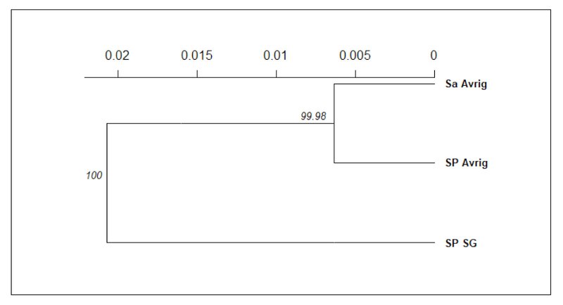 Das Dendrogramm in Abbildung 5 zeigt die Zuordnung von Samen aus der Samenplantage Avrig (Sa_Avrig), basierend auf den genetischen Abständen zwischen den rumänischen Samenplantagen Sfantul Gheorghe (SP_SG) und Avrig (SP_Avrig). Es wird deutlich, dass der größte genetische Unterschied zwischen der Samenplantage Sfantul Gheorghe (SP_SG) und allen anderen Kollektiven liegt. Darüber hinaus ist es sehr wichtig zu unterstreichen, dass die Samen aus der Samenplantage Avrig zu 99,98 % mit den Klonen aus der Samenplantage Avrig gruppiert werden. Dadurch erfolgt eine eindeutige Zuordnung der Samen zu der Samenplantage.