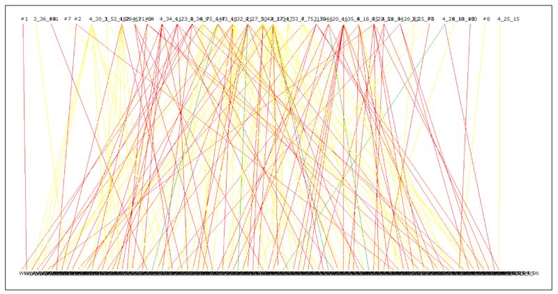 Zeile unten = Individuen der Nachkommenschaft, Zeile oben = Eltern, rote und gelbe Linien = Abstammung von je einem Elter, der als weiblich bzw. männlich angenommen wird, grüne Linie = Abstammung von einem Baum durch Selbstbefruchtung.