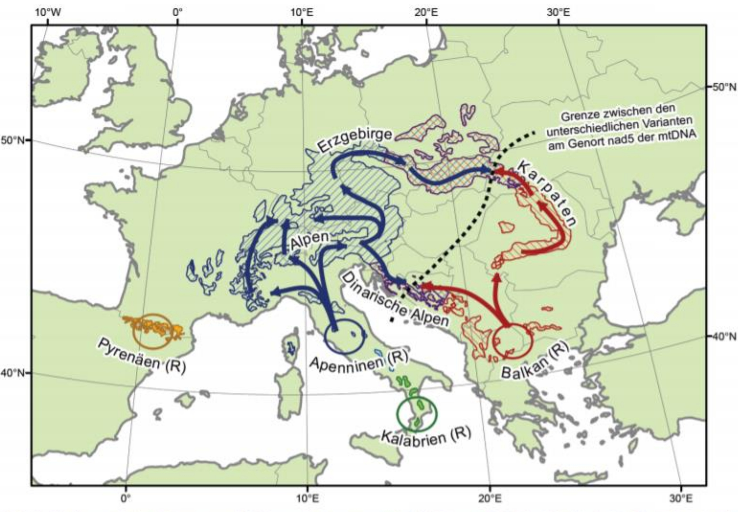 Die Weißtanne hat ein großes natürliches Verbreitungsgebiet in Europa und hat nach der letzten Eiszeit viele Standorte erfolgreich besiedelt. Daneben erfolgte vielerorts eine Einbringung durch den Menschen. Ein wichtiges Refugium während der Eiszeit war der Balkan (Abb. 2). Aus diesem erfolgte die Wiederbesiedlung über die Dinarischen Alpen und die Karpaten. Die Tannenwälder Bayerns wurden hauptsächlich über die Ost-Alpen besiedelt, aus Wäldern, die ursprünglich in Mittelitalien die Eiszeiten überdauert haben. Die Wiederbesiedlung der Karpaten entstammt hauptsächlich den Refugien des südlichen Balkans.
