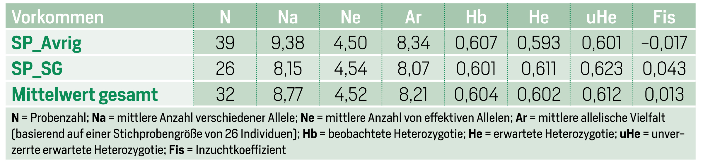 Zuerst erfolgte ein Vergleich der genetischen Vielfalt der rumänischen Samenplantagen (SP_Avrig und SP_SG). Insgesamt ist die genetische Vielfalt in beiden rumänischen Weißtannen-Samenplantagen hoch. Der Vergleich mit den untersuchten Beständen aus der Studie in Rumänien zeigt, dass die genetische Vielfalt vergleichbar mit den Samenplantagen Avrig und SG ist . In der Studie wurden sieben der 15 hier verwendeten Kern-Mikrosatelliten (nSSR) angewandt.