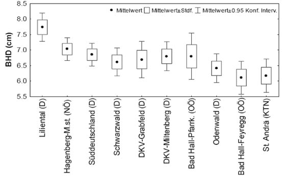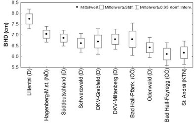Der Kreisflächenmittelstamm über alle drei Versuchsflächen beträgt 6,8 cm und variiert von 6,1 cm (HK Bad Hall-Feyregg) bis 7,7 cm (HK Liliental). Die Plantagenherkunft Liliental aus Freiburg im Breisgau zeigt im Vergleich zu den anderen Herkünften ein statistisch signifikant besseres Durchmesserwachstum. Zwischen den anderen neun Herkünften sind die Unterschiede weit geringer: einzig die niederösterreichische Herkunft Hagenberg-Mittersteig erwies sich besser als der Durchschnitt. (Abbildung 1).